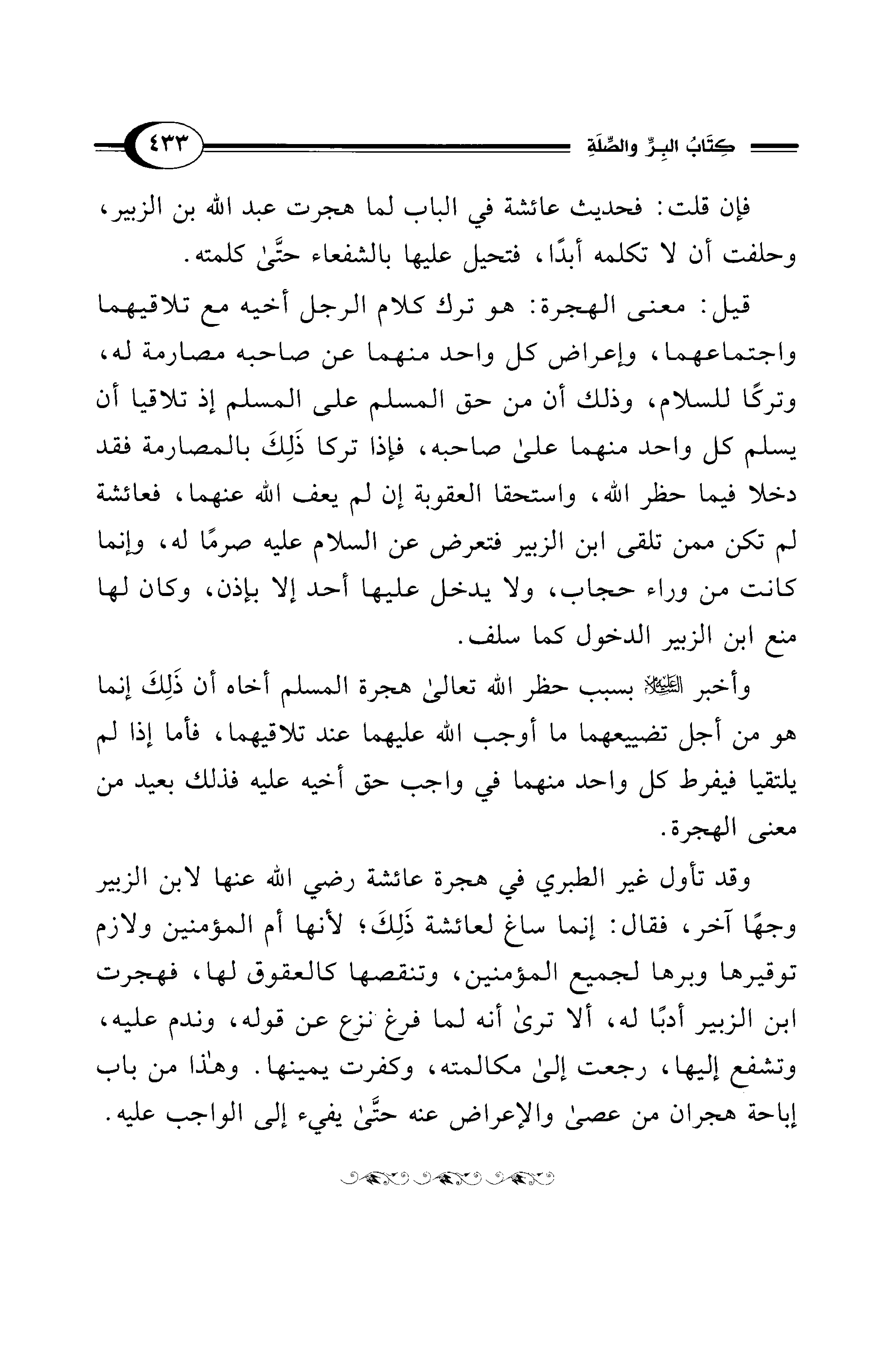 قيل: معنى الهجرة: هو ترك كلام الرجل أخيه مع تلاقيهما واجتماعهما، وإعراض كل واحد منهما عن صاحبه مصارمة له، وتركًا للسلام، وذلك أن من حق المسلم على المسلم إذ تلاقيا أن يسلم كل واحد منهما على صاحبه، فإذا تركا ذَلِكَ بالمصارمة فقد دخلا فيما حظر الله، واستحقا العقوبة إن لم يعف الله عنهما، فعائشة لم تكن ممن تلقى ابن الزبير فتعرض عن السلام عليه صرمًا له، وإنما كانت من وراء حجاب، ولا يدخل عليها أحد إلا بإذن، وكان لها منع ابن الزبير الدخول كما سلف.