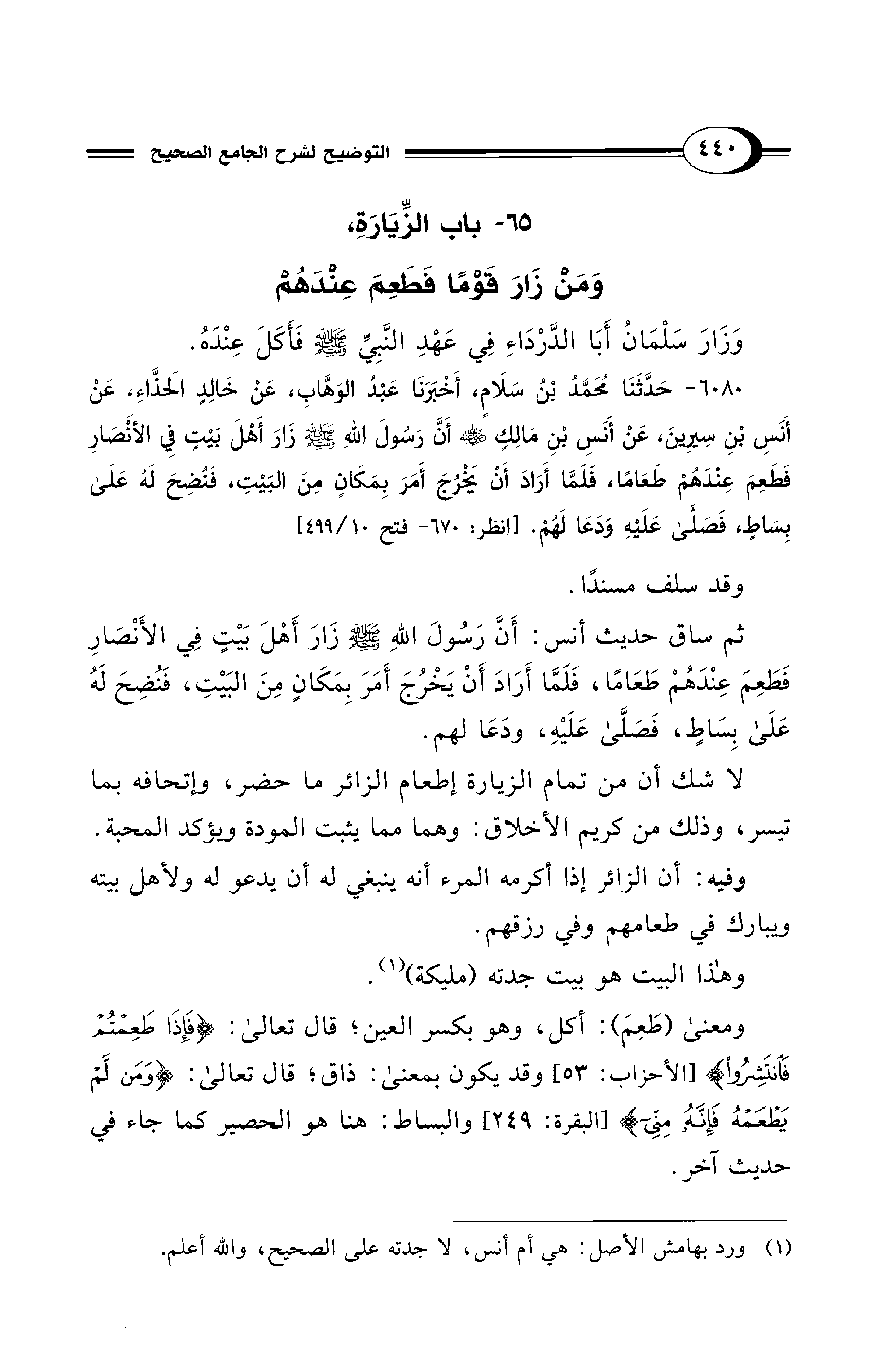 6080 - حَدَّثَنَا مُحَمَّدُ بْنُ سَلاَمٍ، أَخْبَرَنَا عَبْدُ الْوَهَّابِ، عَنْ خَالِدٍ الْحَذَّاءِ، عَنْ أَنَسِ بْنِ سِيرِينَ، عَنْ أَنَسِ بْنِ مَالِكٍ - رضي الله عنه - أَنَّ رَسُولَ اللهِ - صلى الله عليه وسلم - زَارَ أَهْلَ بَيْتٍ فِي الأَنْصَارِ فَطَعِمَ عِنْدَهُمْ طَعَامًا، فَلَمَّا أَرَادَ أَنْ يَخْرُجَ أَمَرَ بِمَكَانٍ مِنَ الْبَيْتِ، فَنُضِحَ لَهُ على بِسَاطٍ، فَصَلَّى عَلَيْهِ وَدَعَا لَهُمْ. [انظر: 670 - فتح 10/ 499]