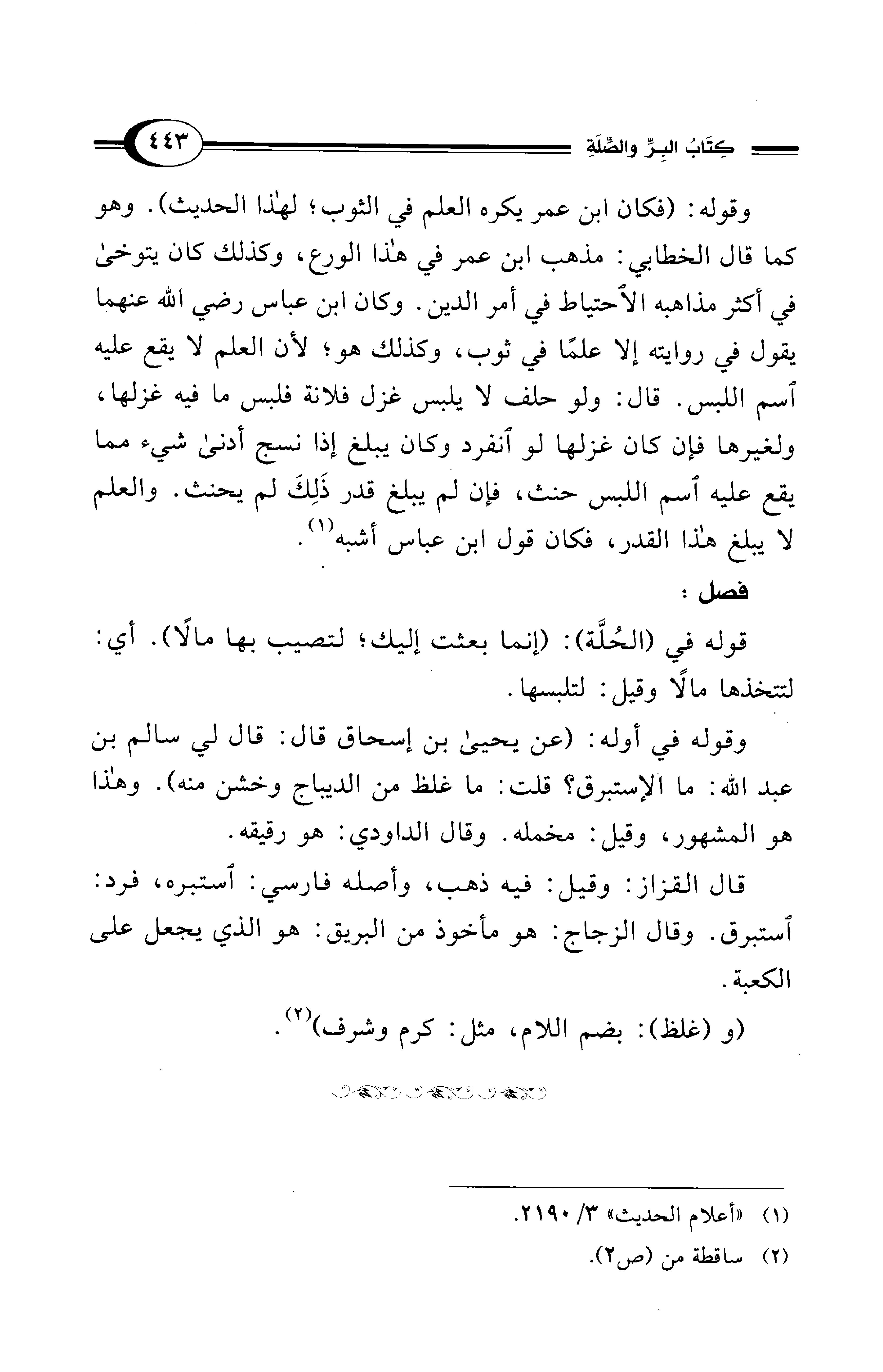 وقوله: (فكان ابن عمر يكره العلم في الثوب؛ لهذا الحديث). وهو كما قال الخطابي: مذهب ابن عمر في هذا الورع، وكذلك كان يتوخى في أكثر مذاهبه الاحتياط في أمر الدين. وكان ابن عباس - رضي الله عنهما - يقول في روايته إلا علمًا في ثوب، وكذلك هو؛ لأن العلم لا يقع عليه اسم اللبس. قال: ولو حلف لا يلبس غزل فلانة فلبس ما فيه غزلها، ولغيرها فإن كان غزلها لو انفرد وكان يبلغ إذا نسج أدنى شيء مما يقع عليه اسم اللبس حنث، فإن لم يبلغ قدر ذَلِكَ لم يحنث. والعلم لا يبلغ هذا القدر، فكان قول ابن عباس أشبه (¬1).