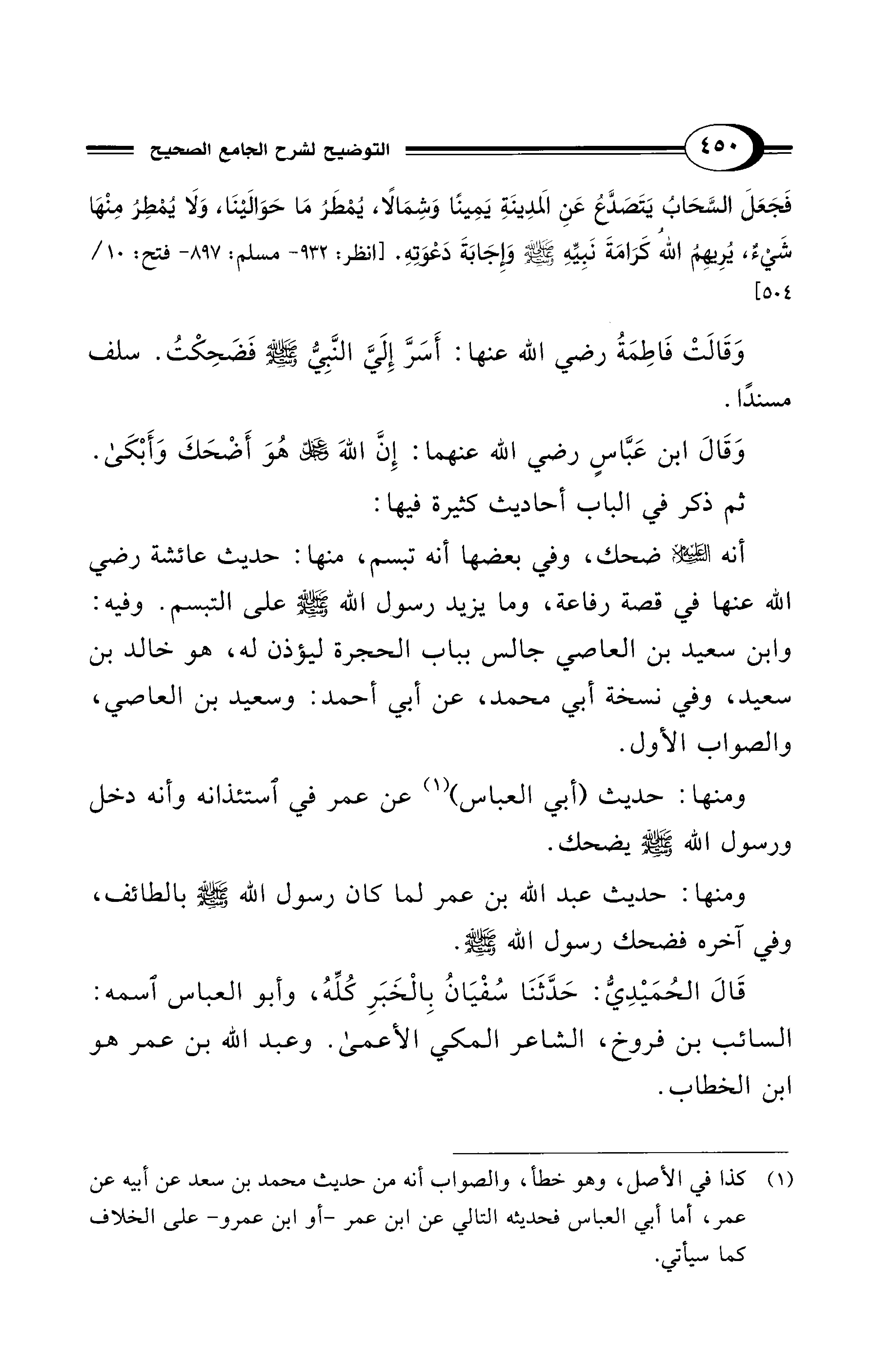 أنه - عليه السلام - ضحك، وفي بعضها أنه تبسم، منها: حديث عائشة - رضي الله عنها - في قصة رفاعة، وما يزيد رسول الله - صلى الله عليه وسلم - على التبسم. وفيه: وابن سعيد بن العاصي جالس بباب الحجرة ليؤذن له، هو خالد بن سعيد، وفي نسخة أبي محمد، عن أبي أحمد: وسعيد بن العاصي، والصواب الأول.