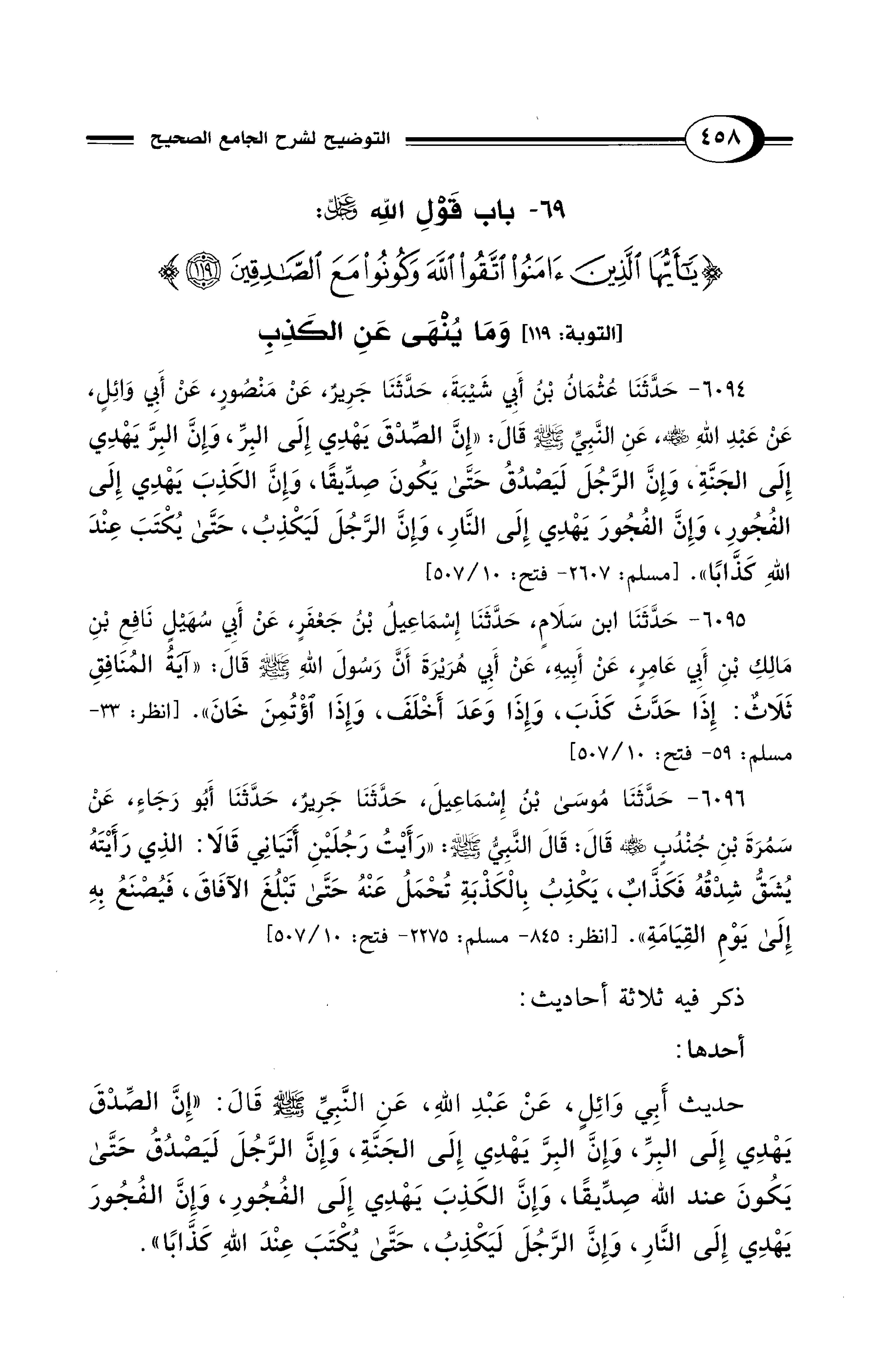 69 - باب قَوْلِ اللهِ -عَزَّ وَجَلَّ-: {يَا أَيُّهَا الَّذِينَ آمَنُوا اتَّقُوا اللهَ وَكُونُوا مَعَ الصَّادِقِينَ (119)} [التوبة: 119] وَمَا يُنْهَى عَنِ الْكَذِبِ