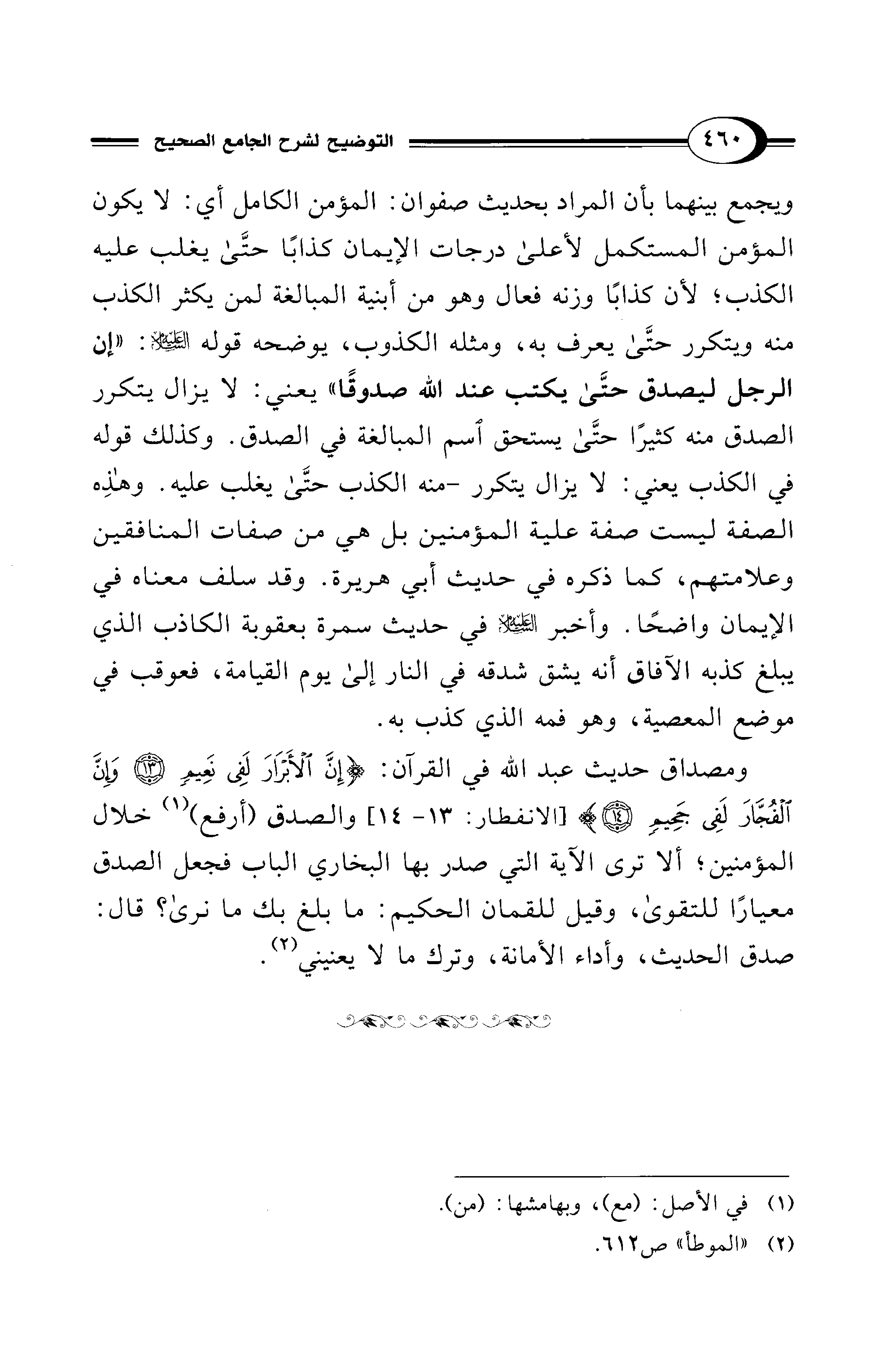 ومصداق حديث عبد الله في القرآن: {إِنَّ الْأَبْرَارَ لَفِي نَعِيمٍ (13) وَإِنَّ الْفُجَّارَ لَفِي جَحِيمٍ (14)} [الانفطار: 13 - 14] والصدق (أرفع) (¬1) خلال المؤمنين؛ ألا ترى الآية التي صدر بها البخاري الباب فجعل الصدق معيارًا للتقوى، وقيل للقمان الحكيم: ما بلغ بك ما نرى؟ قال: صدق الحديث، وأداء الأمانة، وترك ما لا يعنيني (¬2).