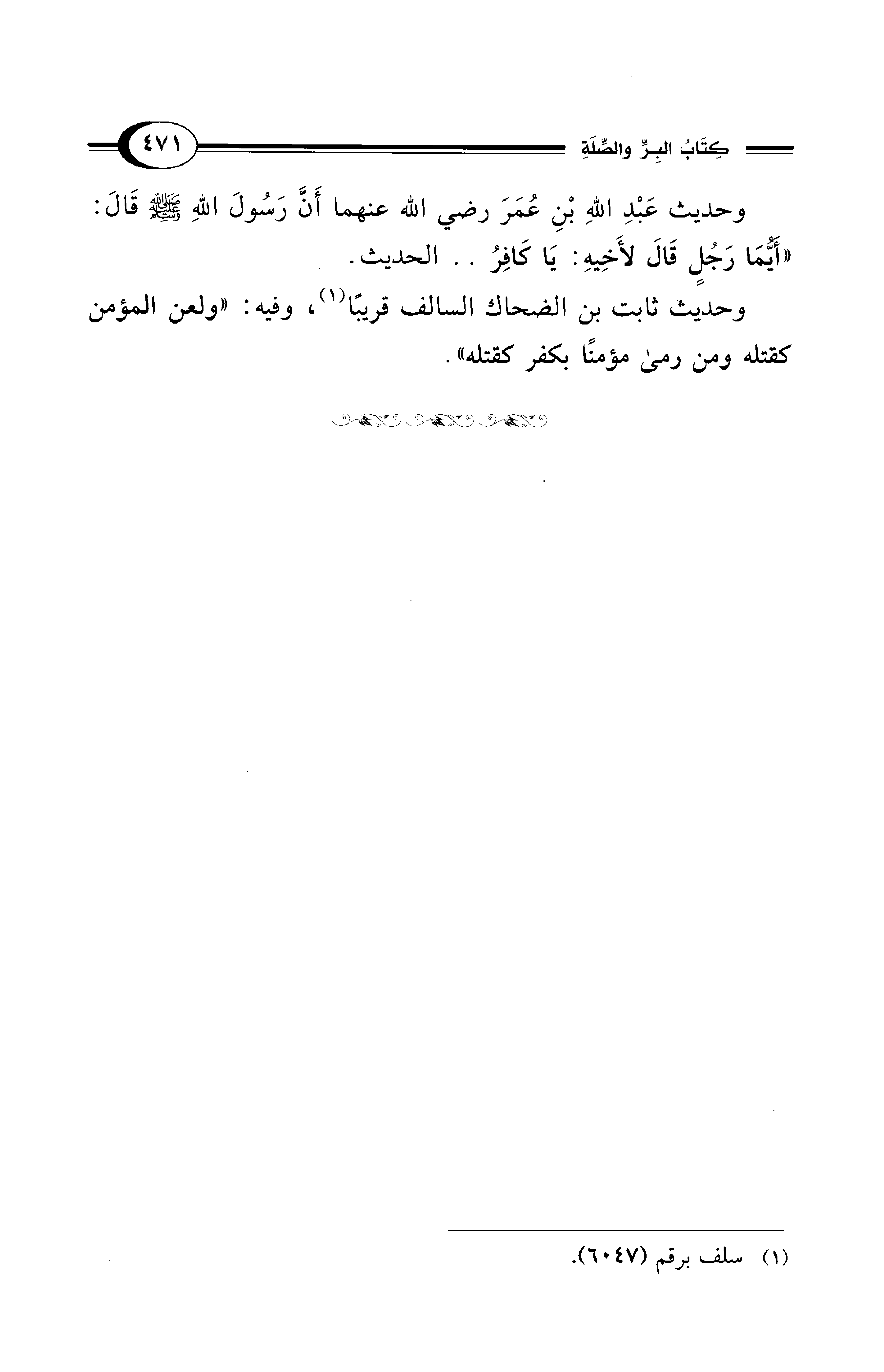 وحديث عَبْدِ اللهِ بْنِ عُمَرَ - رضي الله عنهما - أَنَّ رَسُولَ اللهِ - صلى الله عليه وسلم - قَالَ: "أَيُّمَا رَجُلٍ قَالَ لأَخِيهِ: يَا كَافِرُ .. الحديث.