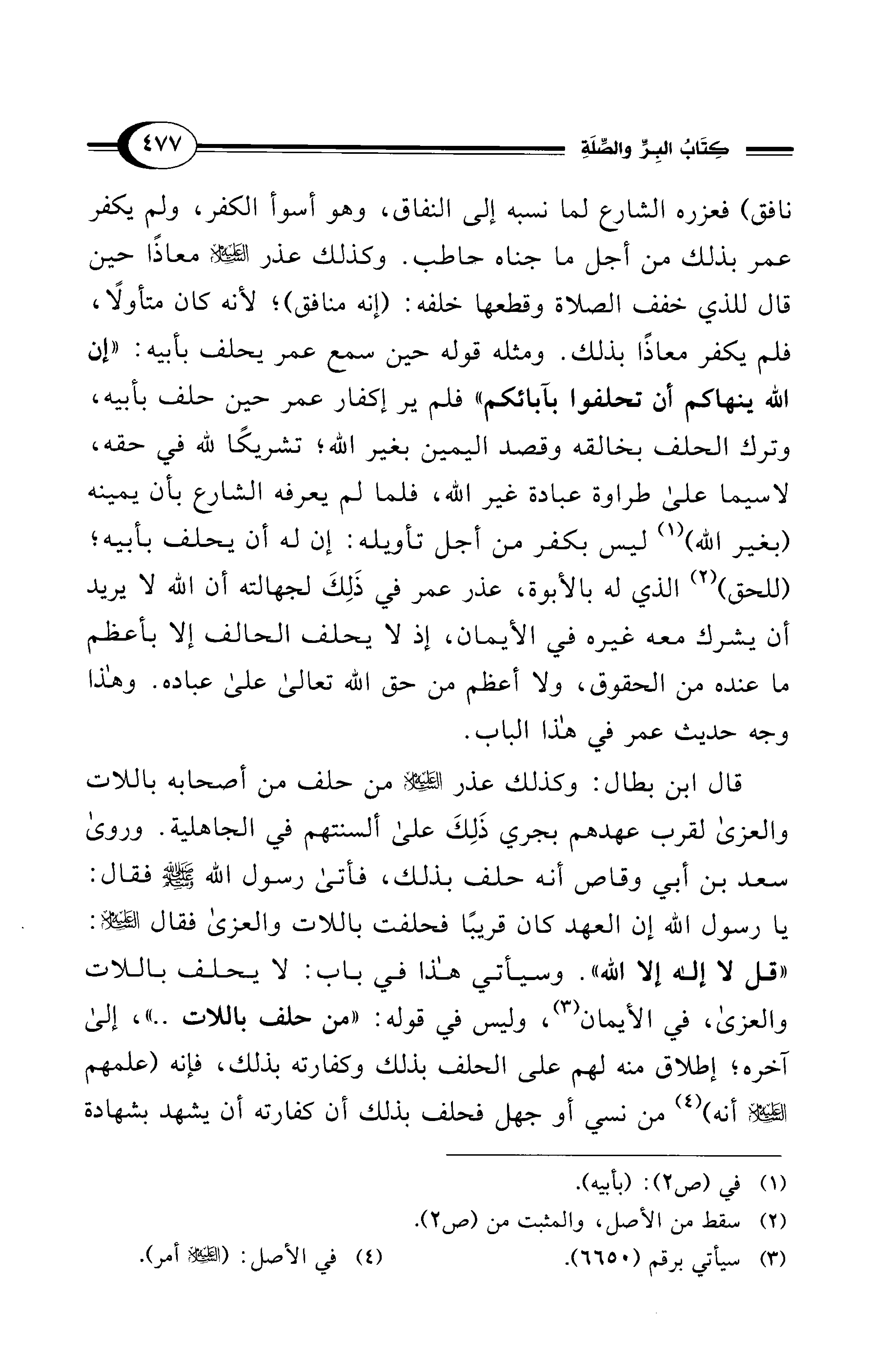 نافق) فعزره الشارع لما نسبه إلى النفاق، وهو أسوأ الكفر، ولم يكفر عمر بذلك من أجل ما جناه حاطب. وكذلك عذر - عليه السلام - معاذًا حين قال للذي خفف الصلاة وقطعها خلفه: (إنه منافق)؛ لأنه كان متأولاً، فلم يكفر معاذًا بذلك. ومثله قوله حين سمع عمر يحلف بأبيه: "إن الله ينهاكم أن تحلفوا بآبائكم" فلم ير إكفار عمر حين حلف بأبيه، وترك الحلف بخالقه وقصد اليمين بغير الله؛ تشريكًا لله في حقه، لا سيما على طراوة عبادة غير الله، فلما لم يعرفه الشارع بأن يمينه (بغير الله) (¬1) ليس بكفر من أجل تأويله: إن له أن يحلف بأبيه؛ (للحق) (¬2) الذي له بالأبوة، عذر عمر في ذَلِكَ لجهالته أن الله لا يريد أن يشرك معه غيره في الأيمان، إذ لا يحلف الحالف إلا بأعظم ما عنده من الحقوق، ولا أعظم من حق الله تعالى على عباده. وهذا وجه حديث عمر في هذا الباب.