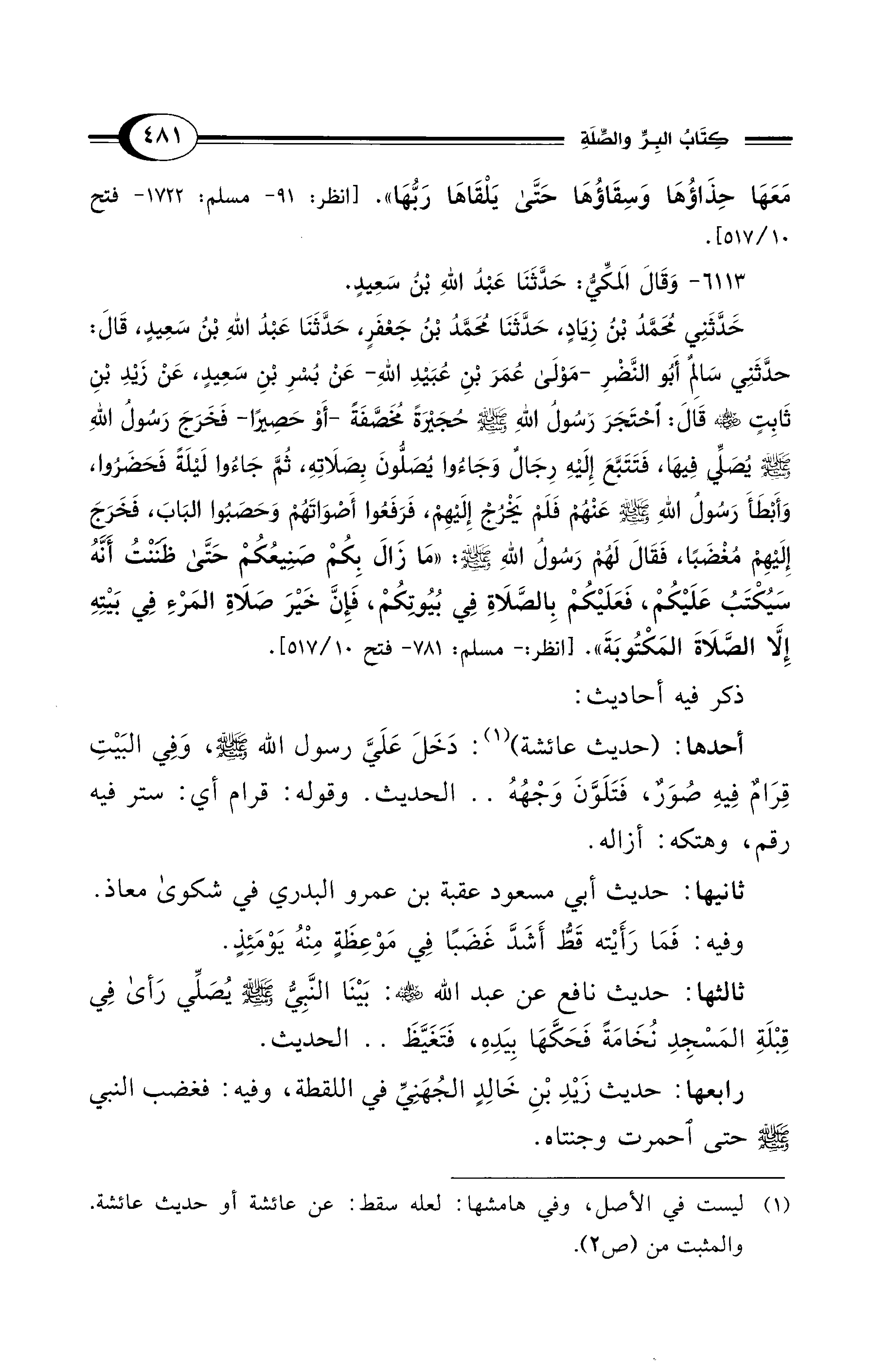 وَحَدَّثَنِي مُحَمَّدُ بْنُ زِيَادٍ، حَدَّثَنَا مُحَمَّدُ بْنُ جَعْفَرٍ، حَدَّثَنَا عَبْدُ اللهِ بْنُ سَعِيدٍ، قَالَ: حَدَّثَنِي سَالِمٌ أَبُو النَّضْرِ -مَوْلَى عُمَرَ بْنِ عُبَيْدِ اللهِ- عَنْ بُسْرِ بْنِ سَعِيدٍ، عَنْ زَيْدِ بْنِ ثَابِتٍ - رضي الله عنه - قَالَ: احْتَجَرَ رَسُولُ اللهِ - صلى الله عليه وسلم - حُجَيْرَةً مُخَصَّفَةً -أَوْ حَصِيرًا- فَخَرَجَ رَسُولُ اللهِ - صلى الله عليه وسلم - يُصَلِّي فِيهَا، فَتَتَبَّعَ إِلَيْهِ رِجَالٌ وَجَاءُوا يُصَلُّونَ بِصَلاَتِهِ، ثُمَّ جَاءُوا لَيْلَةً فَحَضَرُوا، وَأَبْطَأَ رَسُولُ اللهِ - صلى الله عليه وسلم - عَنْهُمْ فَلَمْ يَخْرُجْ إِلَيْهِمْ، فَرَفَعُوا أَصْوَاتَهُمْ وَحَصَبُوا البَابَ، فَخَرَجَ إِلَيْهِمْ مُغْضَبًا، فَقَالَ لَهُمْ رَسُولُ اللهِ - صلى الله عليه وسلم -: «مَا زَالَ بِكُمْ صَنِيعُكُمْ حَتَّى ظَنَنْتُ أَنَّهُ سَيُكْتَبُ عَلَيْكُمْ، فَعَلَيْكُمْ بِالصَّلاَةِ فِي بُيُوتِكُمْ، فَإِنَّ خَيْرَ صَلاَةِ الْمَرْءِ فِي بَيْتِهِ إِلاَّ الصَّلاَةَ الْمَكْتُوبَةَ». [انظر:- مسلم: 781 - فتح 10/ 517].