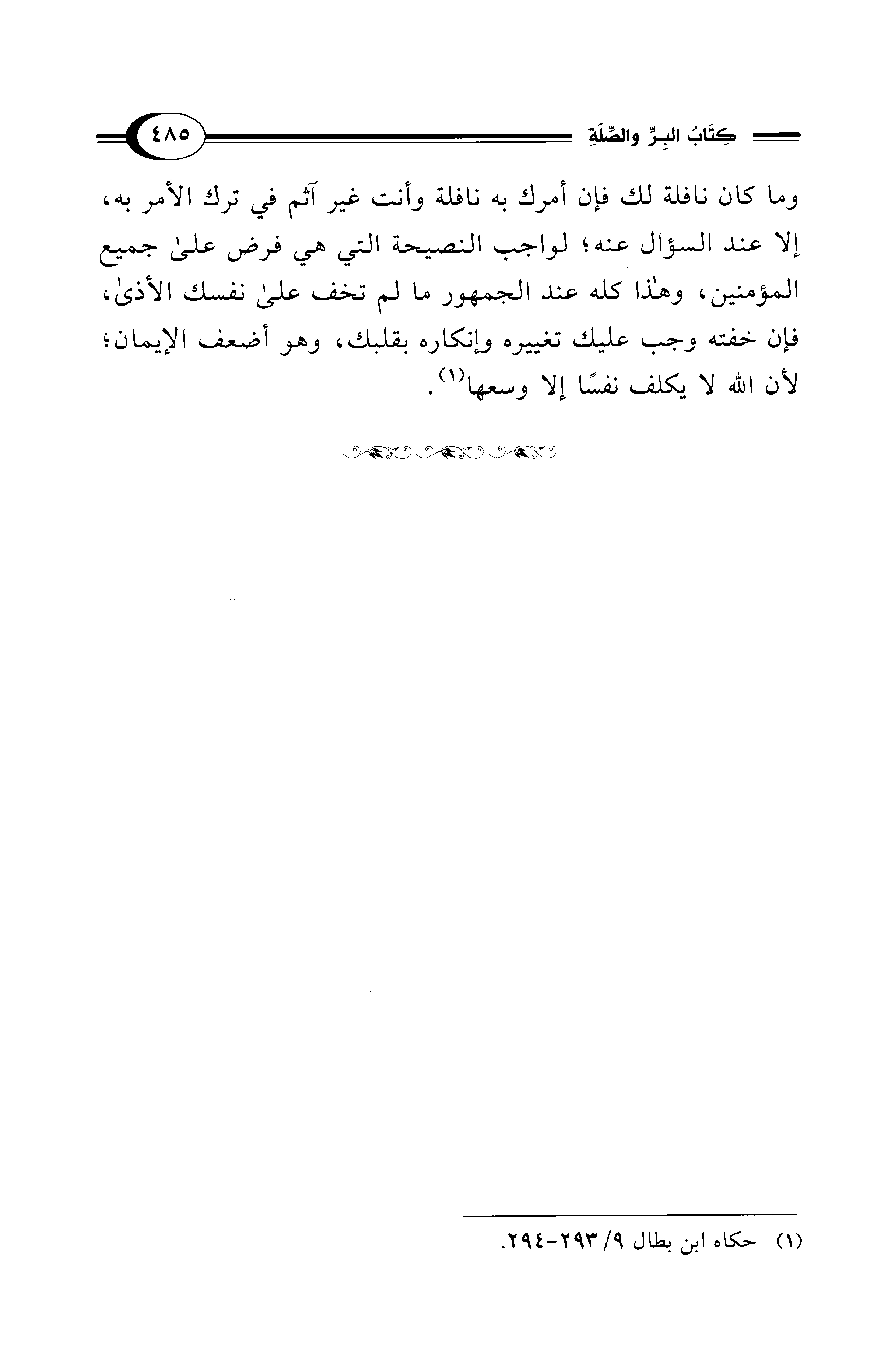 وما كان نافلة لك فإن أمرك به نافلة وأنت غير آثم في ترك الأمر به، إلا عند السؤال عنه؛ لواجب النصيحة التي هي فرض على جميع المؤمنين، وهذا كله عند الجمهور ما لم تخف على نفسك الأذى، فإن خفته وجب عليك تغييره وإنكاره بقلبك، وهو أضعف الإيمان؛ لأن الله لا يكلف نفسًا إلا وسعها (¬1).