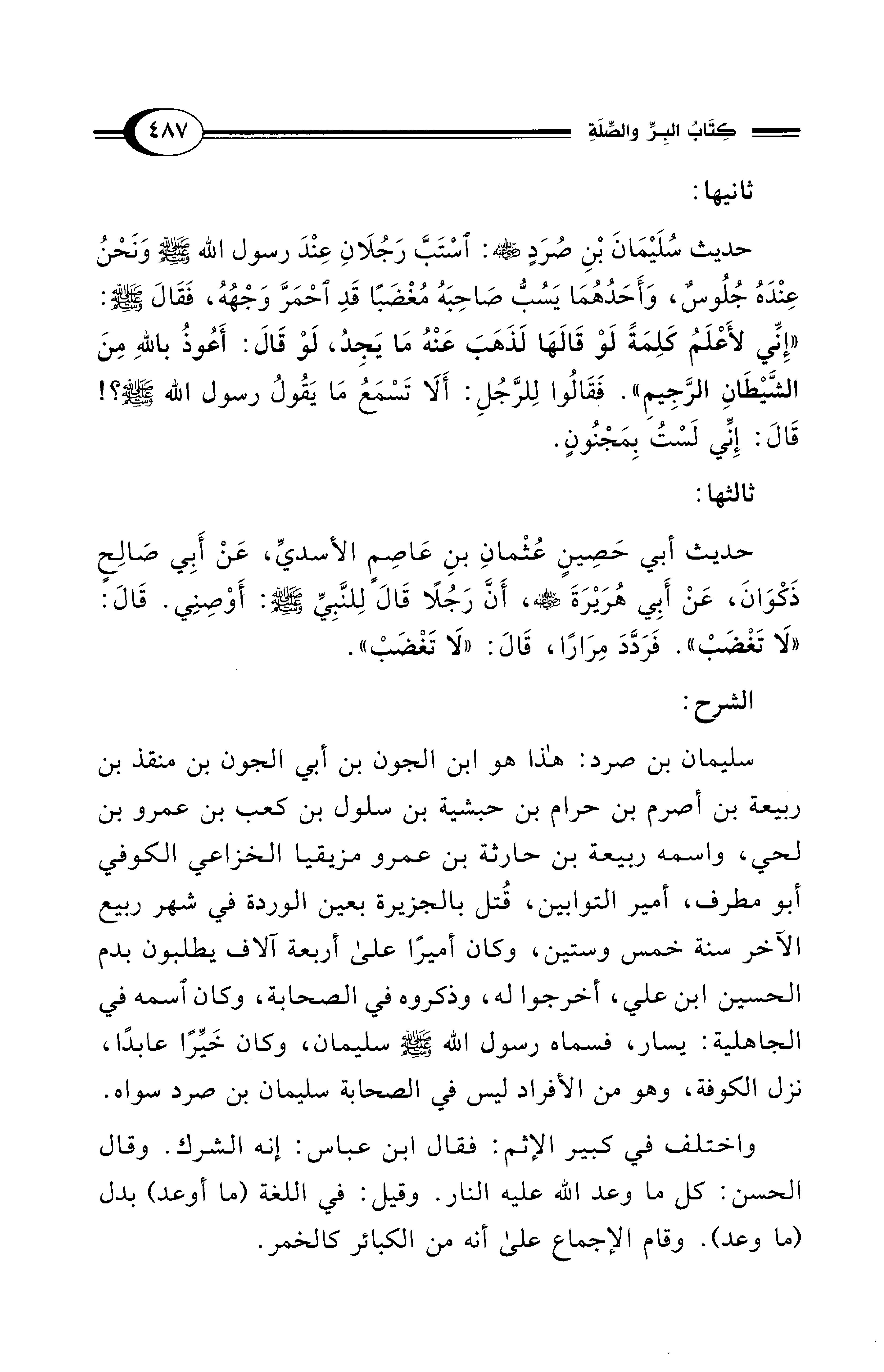 حديث سُلَيْمَانَ بْنِ صُرَدٍ - رضي الله عنه -: اسْتَبَّ رَجُلَانِ عِنْدَ رسول الله - صلى الله عليه وسلم - وَنَحْنُ عِنْدَهُ جُلُوسٌ، وَأَحَدُهُمَا يَسُبُّ صَاحِبَهُ مُغْضَبًا قَدِ احْمَرَّ وَجْهُهُ، فَقَالَ - صلى الله عليه وسلم -: "إِنِّي لأَعْلَمُ كَلِمَةً لَوْ قَالَهَا لَذَهَبَ عَنْهُ مَا يَجِدُ، لَوْ قَالَ: أَعُوذُ باللهِ مِنَ الشَّيْطَانِ الرَّجِيمِ". فَقَالُوا لِلرَّجُلِ: أَلَا تَسْمَعُ مَا يَقُولُ رسول الله - صلى الله عليه وسلم -؟! قَالَ: إِنِّي لَسْتُ بِمَجْنُونٍ.