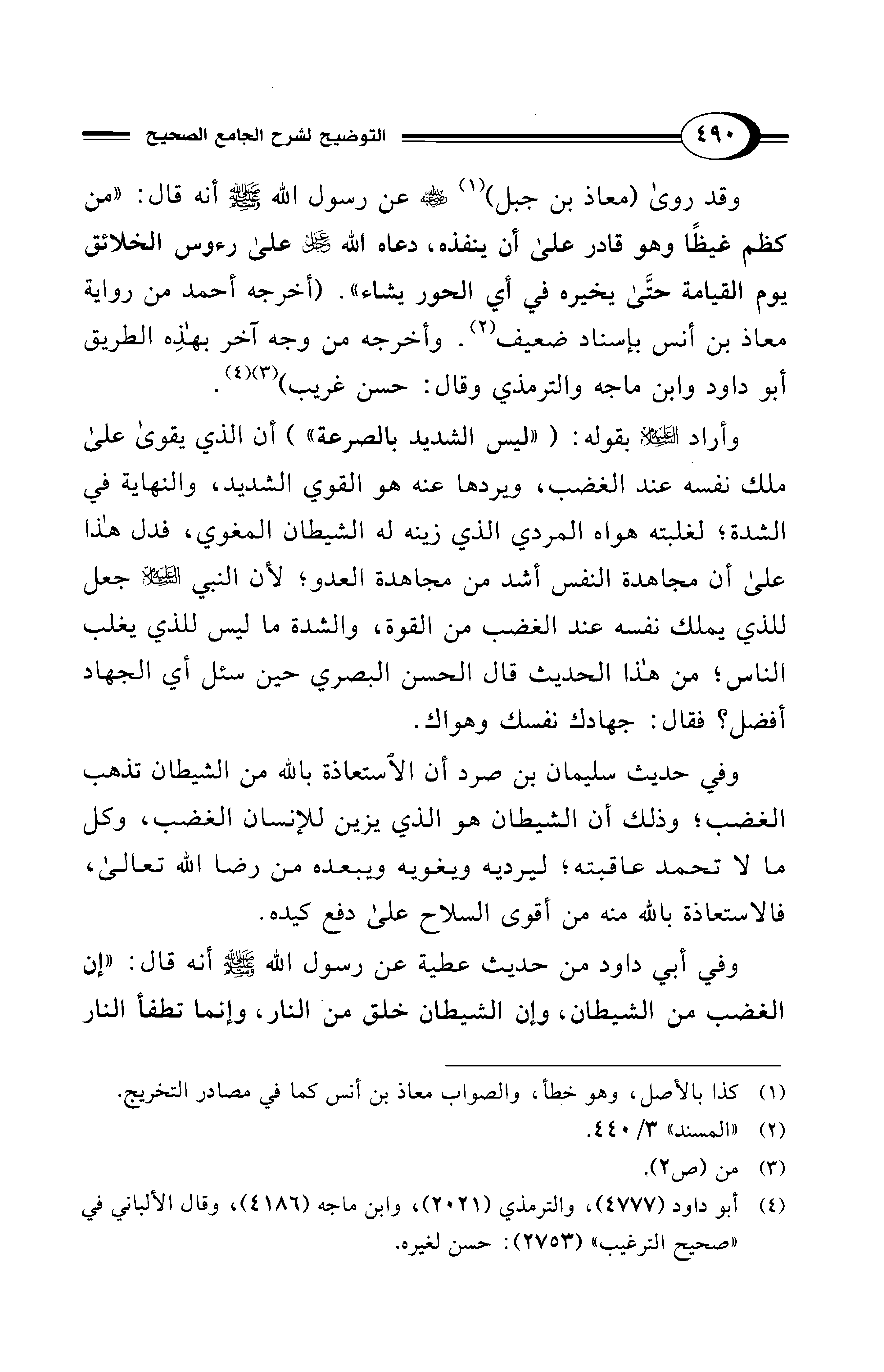 وقد روى (معاذ بن جبل) (¬1) - رضي الله عنه - عن رسول الله - صلى الله عليه وسلم - أنه قال: "من كظم غيظًا وهو قادر على أن ينفذه، دعاه الله -عَزَّ وَجَلَّ- على رءوس الخلائق يوم القيامة حتَّى يخيره في أي الحور يشاء". (أخرجه أحمد من رواية معاذ بن أنس بإسناد ضعيف (¬2). وأخرجه من وجه آخر بهذِه الطريق أبو داود وابن ماجه والترمذي وقال: حسن غريب) (¬3) (¬4).