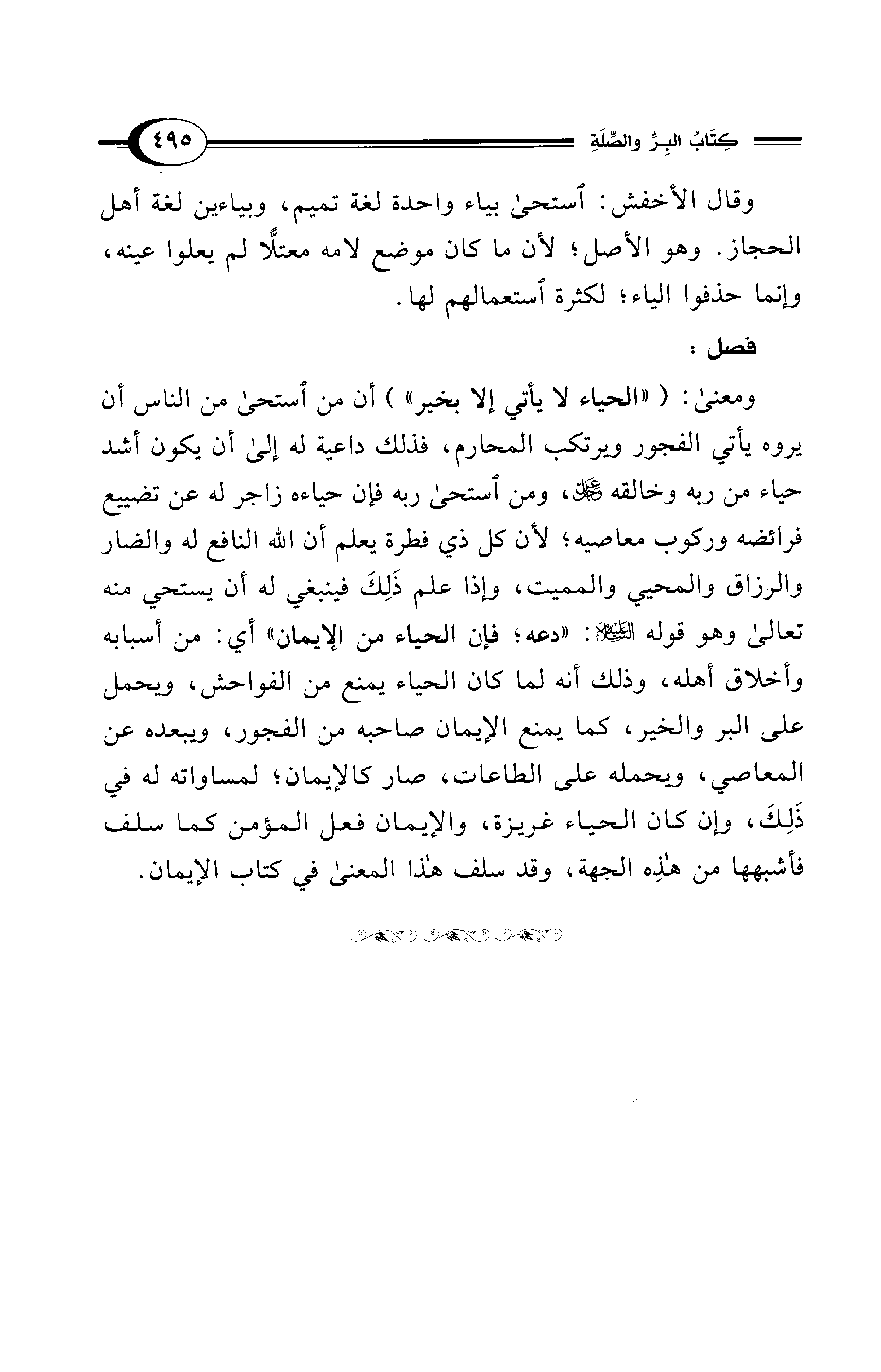 ومعنى: ("الحياء لا يأتي إلا بخير") أن من استحى من الناس أن يروه يأتي الفجور ويرتكب المحارم، فذلك داعية له إلى أن يكون أشد حياء من ربه وخالقه -عَزَّ وَجَلَّ-، ومن استحى ربه فإن حياءه زاجر له عن تضييع فرائضه وركوب معاصيه؛ لأن كل ذي فطرة يعلم أن الله النافع له والضار والرزاق والمحيي والمميت، وإذا علم ذَلِكَ فينبغي له أن يستحي منه تعالى وهو قوله - عليه السلام -: "دعه؛ فإن الحياء من الإيمان" أي: من أسبابه وأخلاق أهله، وذلك أنه لما كان الحياء يمنع من الفواحش، ويحمل على البر والخير، كما يمنع الإيمان صاحبه من الفجور، ويبعده عن المعاصي، ويحمله على الطاعات، صار كالإيمان؛ لمساواته له في ذَلِكَ، وإن كان الحياء غريزة، والإيمان فعل المؤمن كما سلف فأشبهها من هذِه الجهة، وقد سلف هذا المعنى في كتاب الإيمان.