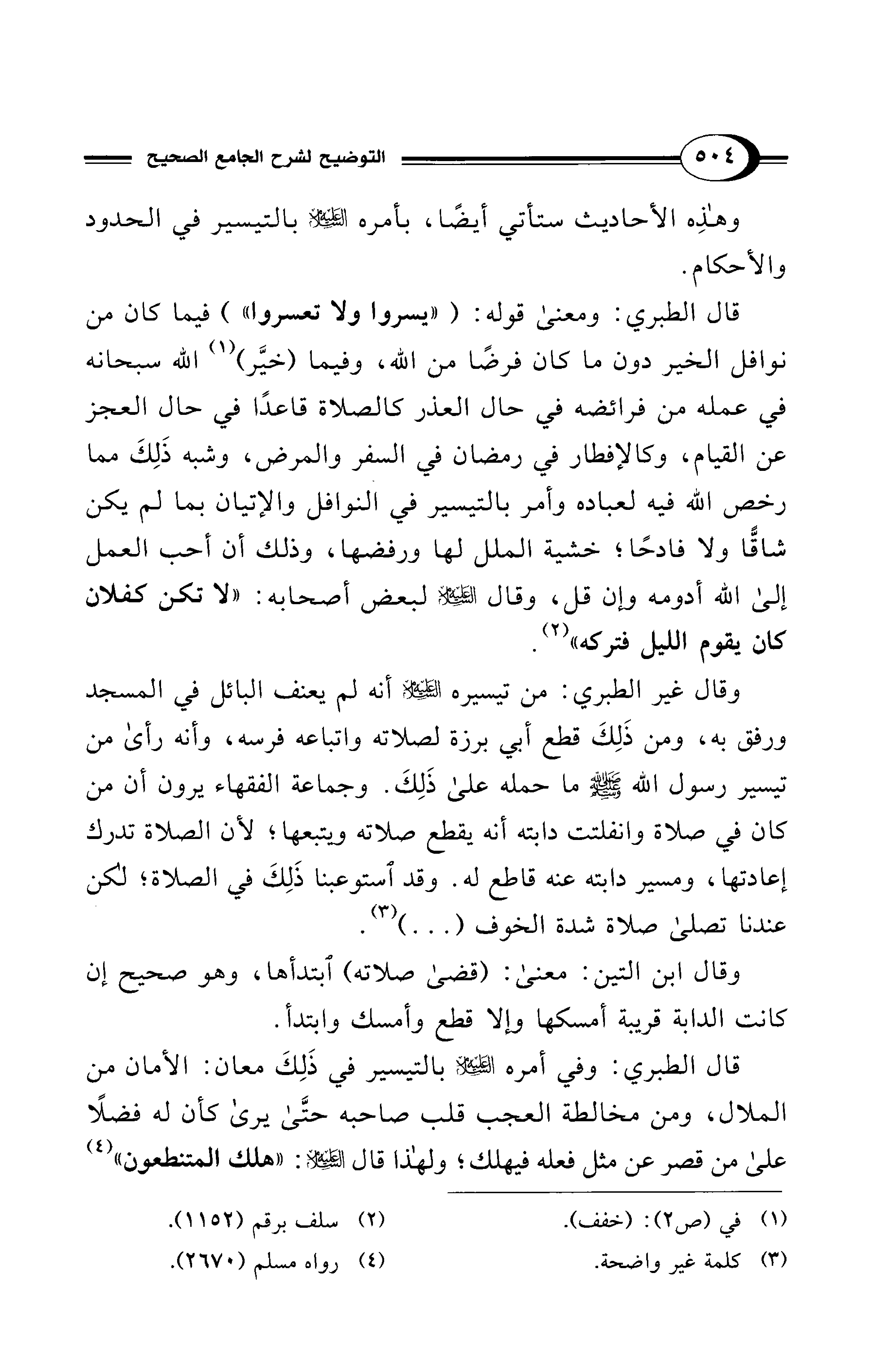 قال الطبري: وفي أمره - عليه السلام - بالتيسير في ذَلِكَ معان: الأمان من الملال، ومن مخالطة العجب قلب صاحبه حتَّى يرى كأن له فضلاً على من قصر عن مثل فعله فيهلك؛ ولهذا قال - عليه السلام -: "هلك المتنطعون" (¬4)