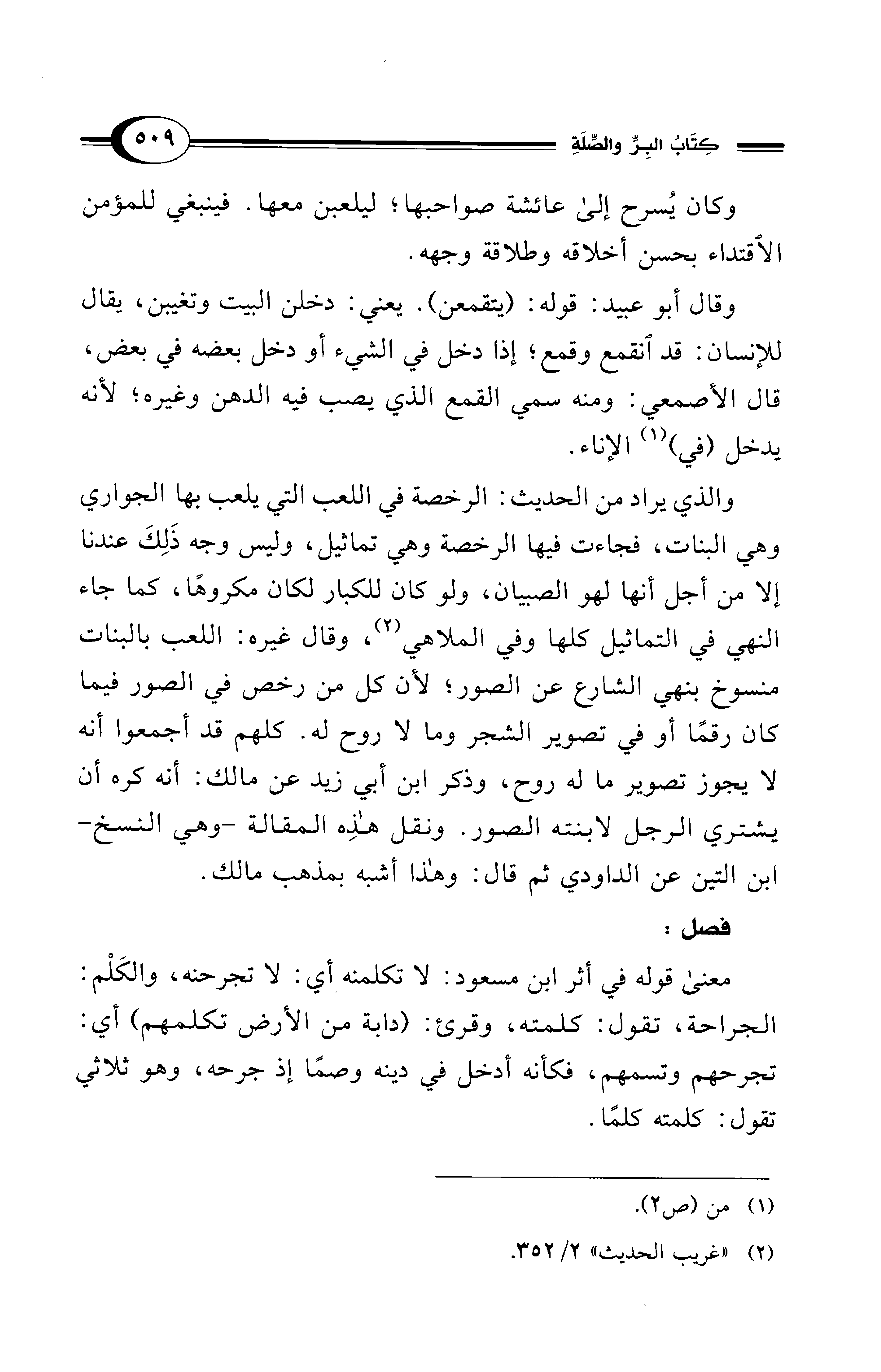 وكان يُسرح إلى عائشة صواحبها؛ ليلعبن معها. فينبغي للمؤمن الاقتداء بحسن أخلاقه وطلاقة وجهه.