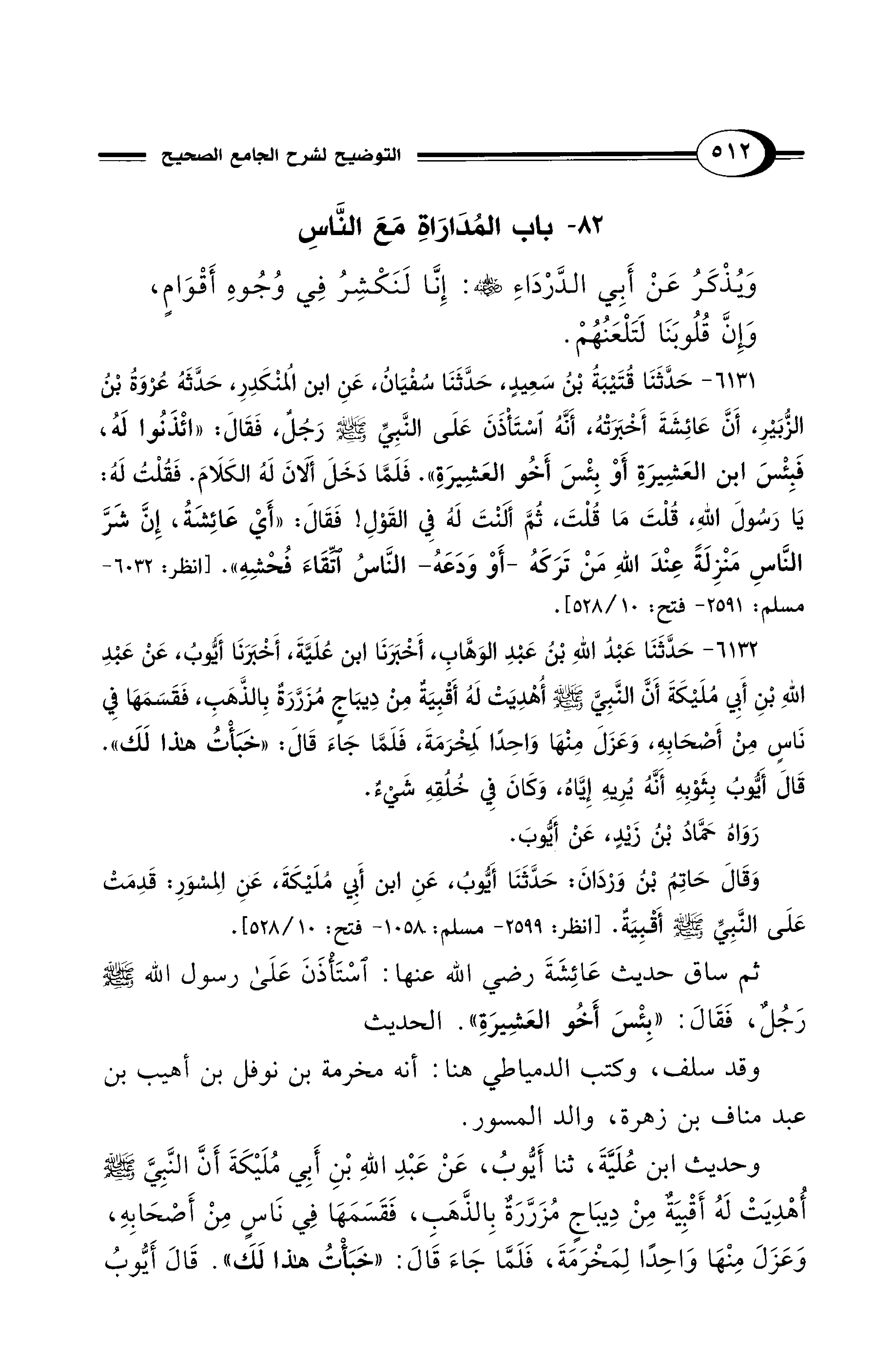 6131 - حَدَّثَنَا قُتَيْبَةُ بْنُ سَعِيدٍ، حَدَّثَنَا سُفْيَانُ، عَنِ ابْنِ الْمُنْكَدِرِ، حَدَّثَهُ عُرْوَةُ بْنُ الزُّبَيْرِ، أَنَّ عَائِشَةَ أَخْبَرَتْهُ، أَنَّهُ اسْتَأْذَنَ على النَّبِيِّ - صلى الله عليه وسلم - رَجُلٌ، فَقَالَ: «ائْذَنُوا لَهُ، فَبِئْسَ ابْنُ الْعَشِيرَةِ أَوْ بِئْسَ أَخُو الْعَشِيرَةِ». فَلَمَّا دَخَلَ أَلاَنَ لَهُ الْكَلاَمَ. فَقُلْتُ لَهُ: يَا رَسُولَ اللهِ، قُلْتَ مَا قُلْتَ، ثُمَّ أَلَنْتَ لَهُ فِي الْقَوْلِ! فَقَالَ: «أَيْ عَائِشَةُ، إِنَّ شَرَّ النَّاسِ مَنْزِلَةً عِنْدَ اللهِ مَنْ تَرَكَهُ -أَوْ وَدَعَهُ- النَّاسُ اتِّقَاءَ فُحْشِهِ». [انظر: 6032 - مسلم: 2591 - فتح: 10/ 528].