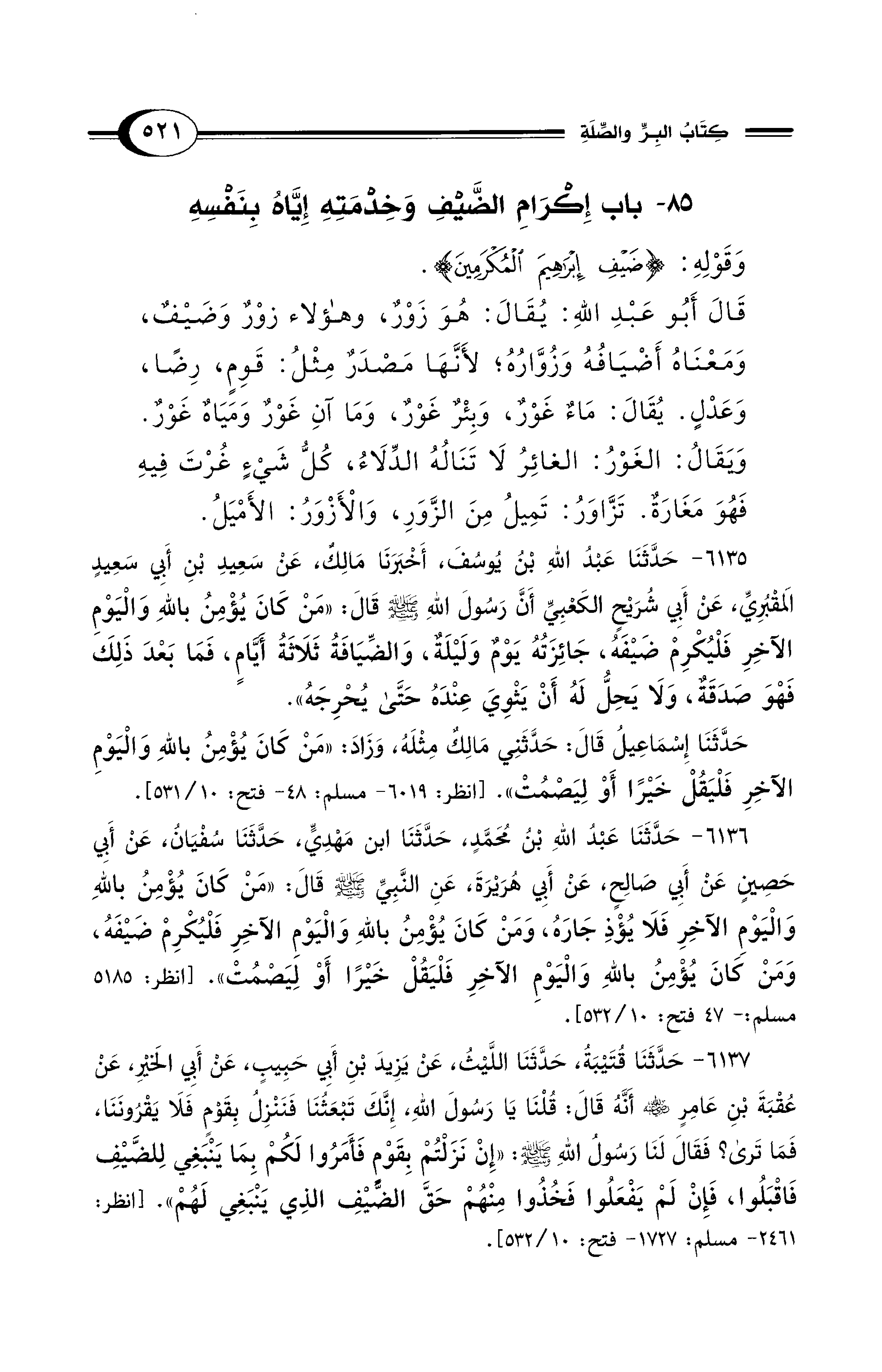 6135 - حَدَّثَنَا عَبْدُ اللهِ بْنُ يُوسُفَ، أَخْبَرَنَا مَالِكٌ، عَنْ سَعِيدِ بْنِ أَبِي سَعِيدٍ الْمَقْبُرِيِّ، عَنْ أَبِي شُرَيْحٍ الْكَعْبِيِّ أَنَّ رَسُولَ اللهِ - صلى الله عليه وسلم - قَالَ: «مَنْ كَانَ يُؤْمِنُ بِاللهِ وَالْيَوْمِ الآخِرِ فَلْيُكْرِمْ ضَيْفَهُ، جَائِزَتُهُ يَوْمٌ وَلَيْلَةٌ، وَالضِّيَافَةُ ثَلاَثَةُ أَيَّامٍ، فَمَا بَعْدَ ذَلِكَ فَهْوَ صَدَقَةٌ، وَلاَ يَحِلُّ لَهُ أَنْ يَثْوِيَ عِنْدَهُ حَتَّى يُحْرِجَهُ».