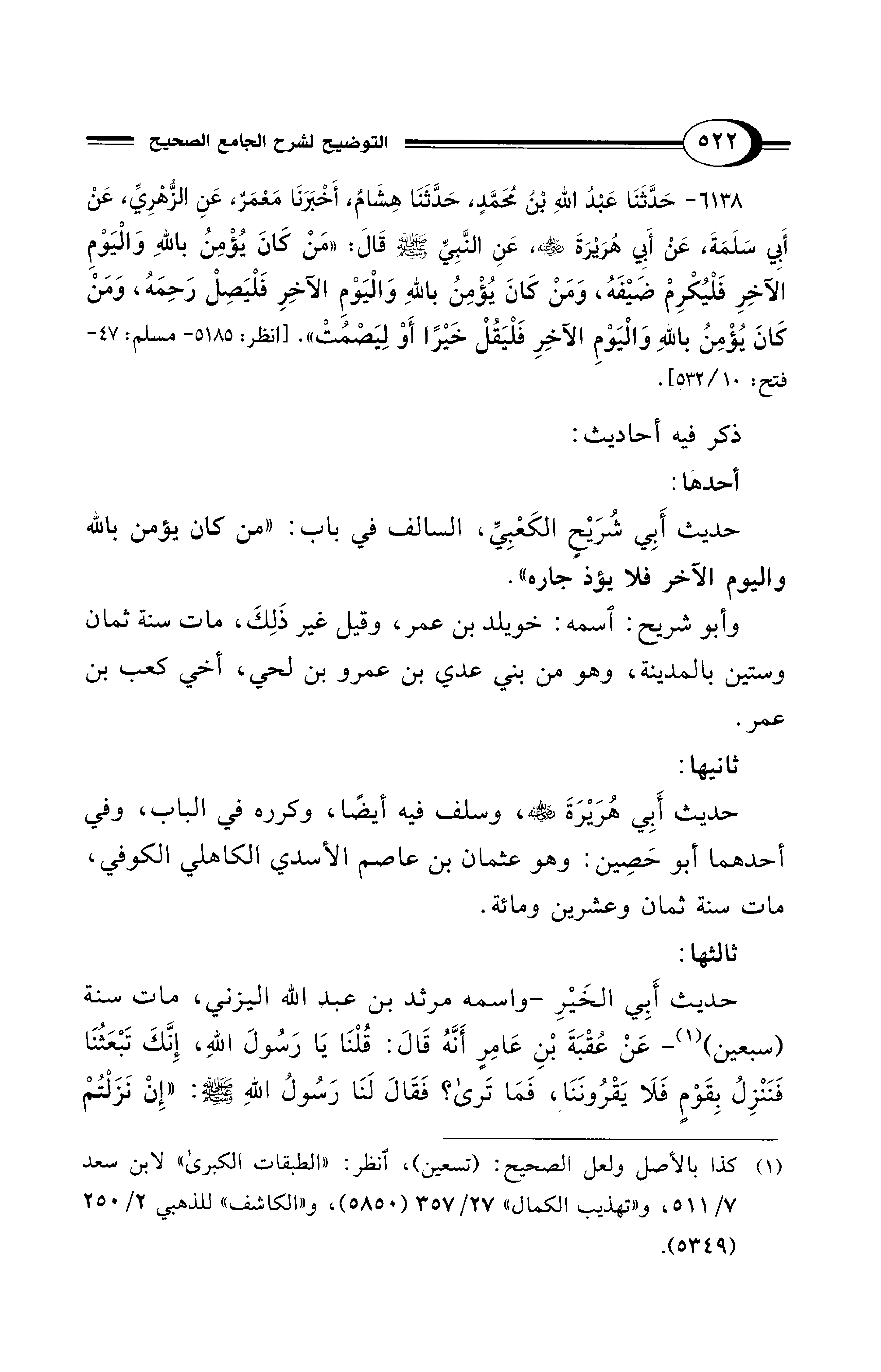 حديث أَبِي شُرَيْحٍ الكَعْبِيِّ، السالف في باب: "من كان يؤمن بالله واليوم الآخر فلا يؤذ جاره".