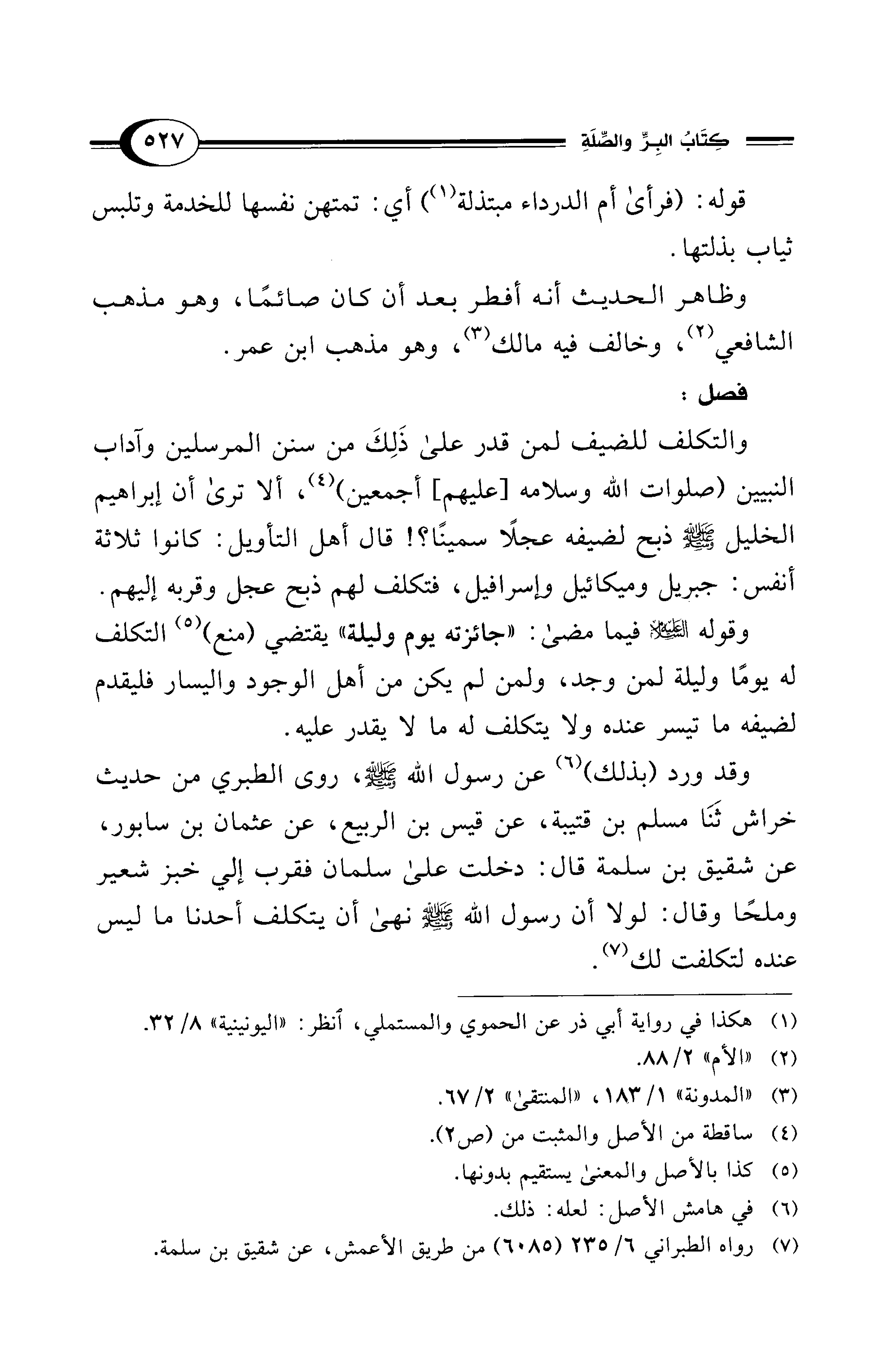 والتكلف للضيف لمن قدر على ذَلِكَ من سنن المرسلين وآداب النبيين (صلوات الله وسلامه [عليهم] أجمعين) (¬4)، ألا ترى أن إبراهيم الخليل - صلى الله عليه وسلم - ذبح لضيفه عجلًا سمينًا؟! قال أهل التأويل: كانوا ثلاثة أنفس: جبريل وميكائيل وإسرافيل، فتكلف لهم ذبح عجل وقربه إليهم.