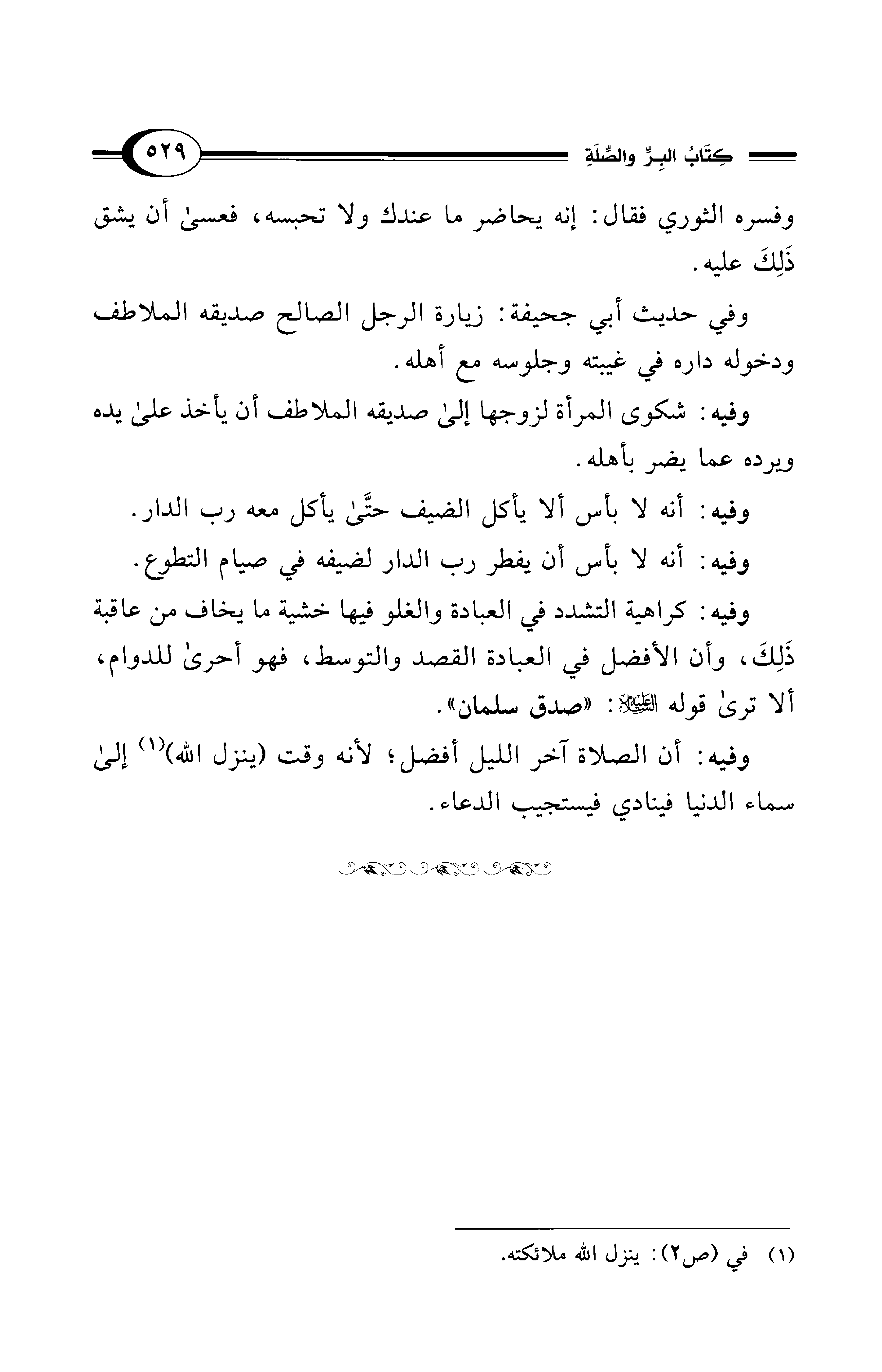 وفي حديث أبي جحيفة: زيارة الرجل الصالح صديقه الملاطف ودخوله داره في غيبته وجلوسه مع أهله.