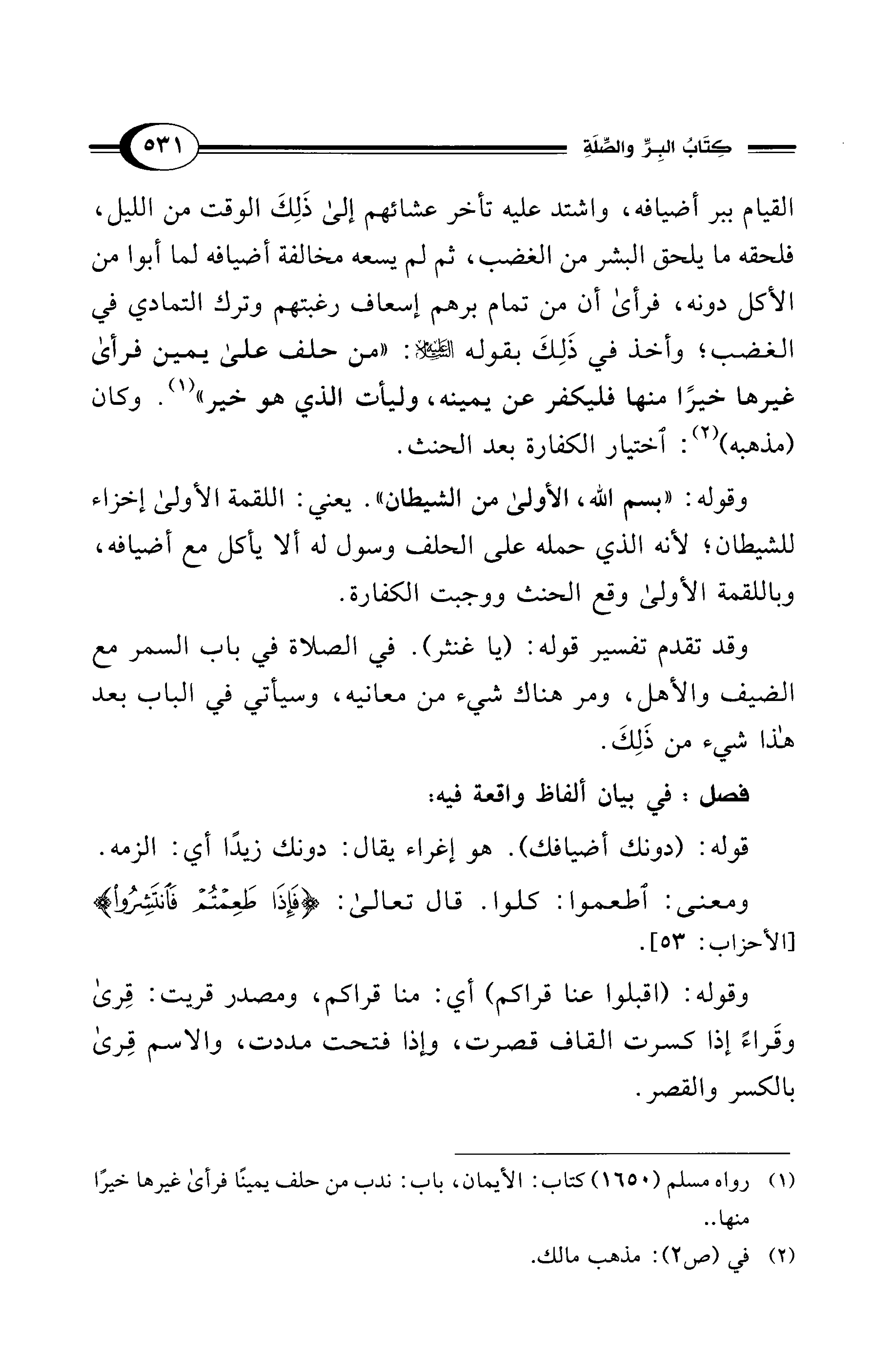 القيام ببر أضيافه، واشتد عليه تأخر عشائهم إلى ذَلِكَ الوقت من الليل، فلحقه ما يلحق البشر من الغضب، ثم لم يسعه مخالفة أضيافه لما أبوا من الأكل دونه، فرأى أن من تمام برهم إسعاف رغبتهم وترك التمادي في الغضب؛ وأخذ في ذَلِكَ بقوله - عليه السلام -: "من حلف على يمين فرأى غيرها خيرًا منها فليكفر عن يمينه، وليأت الذي هو خير" (¬1). وكان (مذهبه) (¬2): اختيار الكفارة بعد الحنث.