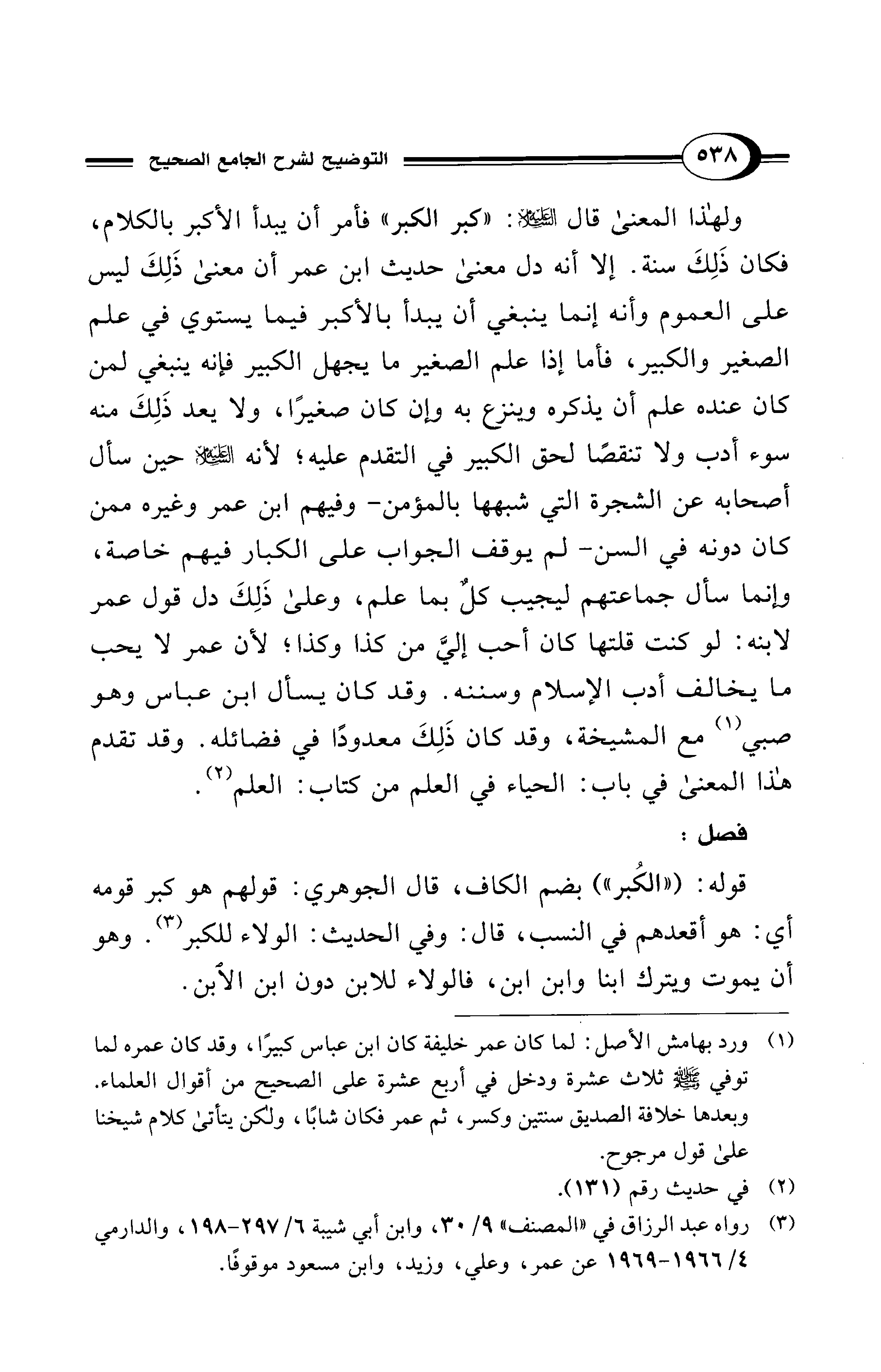 ولهذا المعنى قال - عليه السلام -: "كبر الكبر" فأمر أن يبدأ الأكبر بالكلام، فكان ذَلِكَ سنة. إلا أنه دل معنى حديث ابن عمر أن معنى ذَلِكَ ليس على العموم وأنه إنما ينبغي أن يبدأ بالأكبر فيما يستوي في علم الصغير والكبير، فأما إذا علم الصغير ما يجهل الكبير فإنه ينبغي لمن كان عنده علم أن يذكره وينزع به وإن كان صغيرًا، ولا يعد ذَلِكَ منه سوء أدب ولا تنقصًا لحق الكبير في المتقدم عليه؛ لأنه - عليه السلام - حين سأل أصحابه عن الشجرة التي شبهها بالمؤمن- وفيهم ابن عمر وغيره ممن كان دونه في السن- لم يوقف الجواب على الكبار فيهم خاصة، وإنما سأل جماعتهم ليجيب كلٌ بما علم، وعلى ذَلِكَ دل قول عمر لابنه: لو كنت قلتها كان أحب إليَّ من كذا وكذا؛ لأن عمر لا يحب ما يخالف أدب الإسلام وسننه. وقد كان يسأل ابن عباس وهو صبي (¬1) مع المشيخة، وقد كان ذَلِكَ معدودًا في فضائله. وقد تقدم هذا المعنى في باب: الحياء في العلم من كتاب: العلم (¬2).