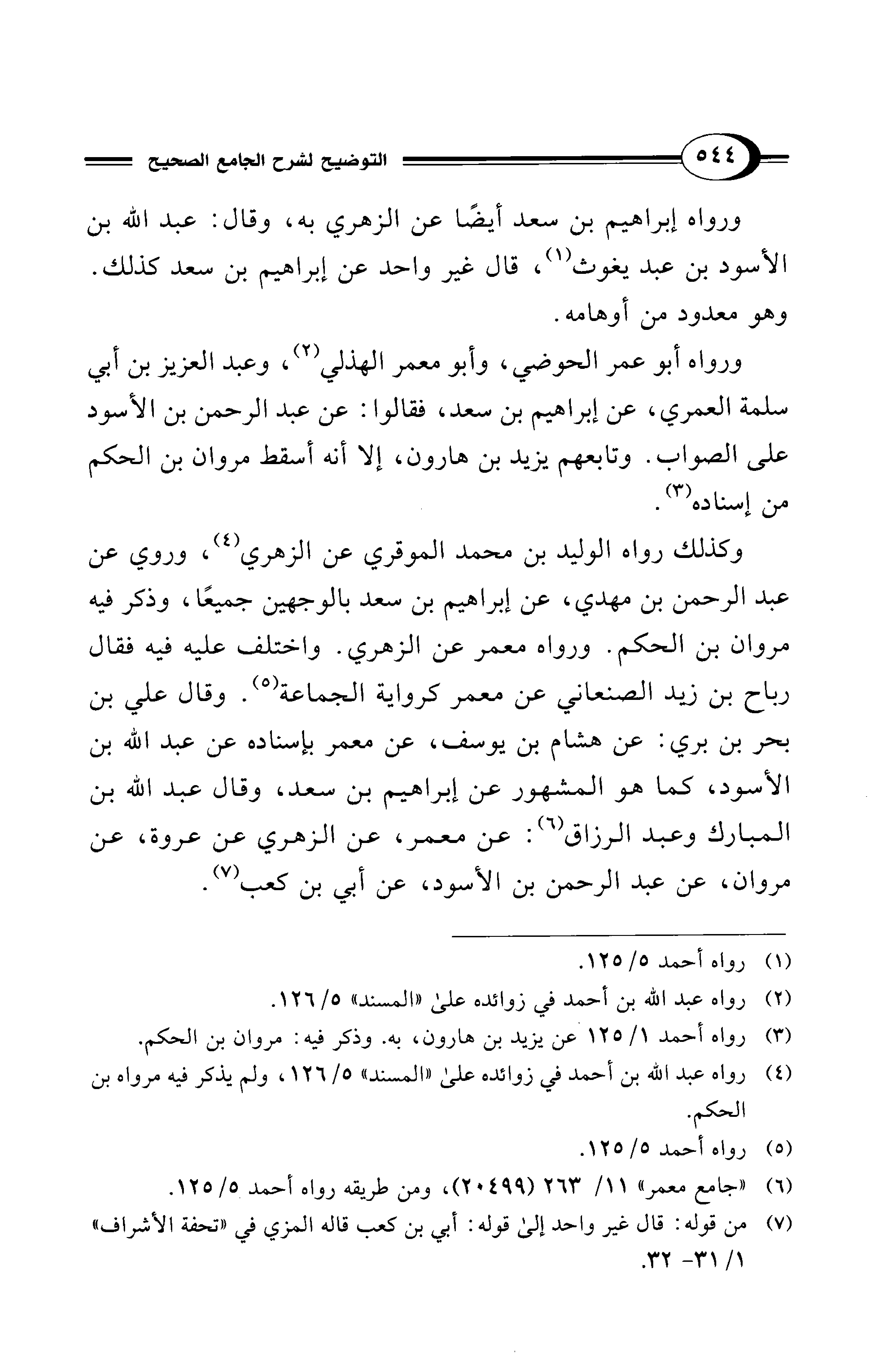 وكذلك رواه الوليد بن محمد الموقري عن الزهري (¬4)، وروي عن عبد الرحمن بن مهدي، عن إبراهيم بن سعد بالوجهين جميعًا، وذكر فيه مروان بن الحكم. ورواه معمر عن الزهري. واختلف عليه فيه فقال رباح بن زيد الصنعاني عن معمر كرواية الجماعة (¬5). وقال علي بن بحر بن بري: عن هشام بن يوسف، عن معمر بإسناده عن عبد الله بن الأسود، كما هو المشهور عن إبراهيم بن سعد، وقال عبد الله بن المبارك وعبد الرزاق (¬6): عن معمر، عن الزهري عن عروة، عن مروان، عن عبد الرحمن بن الأسود، عن أبي بن كعب (¬7).