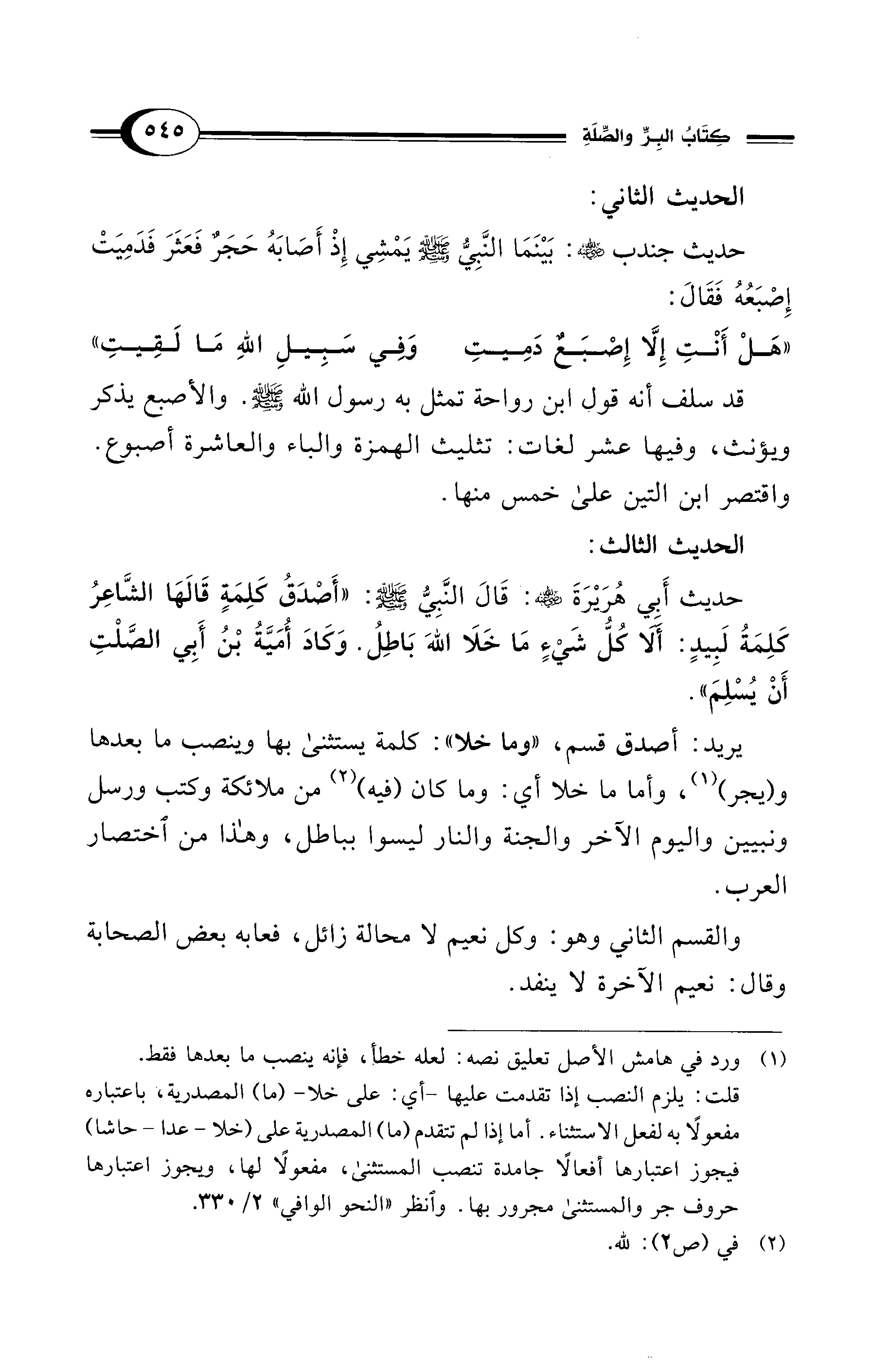 حديث أَبِي هُرَيْرَةَ - رضي الله عنه -: قَالَ النَّبِيُّ - صلى الله عليه وسلم -: "أَصْدَقُ كَلِمَةٍ قَالَهَا الشَّاعِرُ كَلِمَةُ لَبِيدٍ: أَلَا كُلُّ شَيْءٍ مَا خَلَا اللهَ بَاطِلُ. وَكادَ أُمَيَّةُ بْنُ أَبِي الصَّلْتِ أَنْ يُسْلِمَ".
