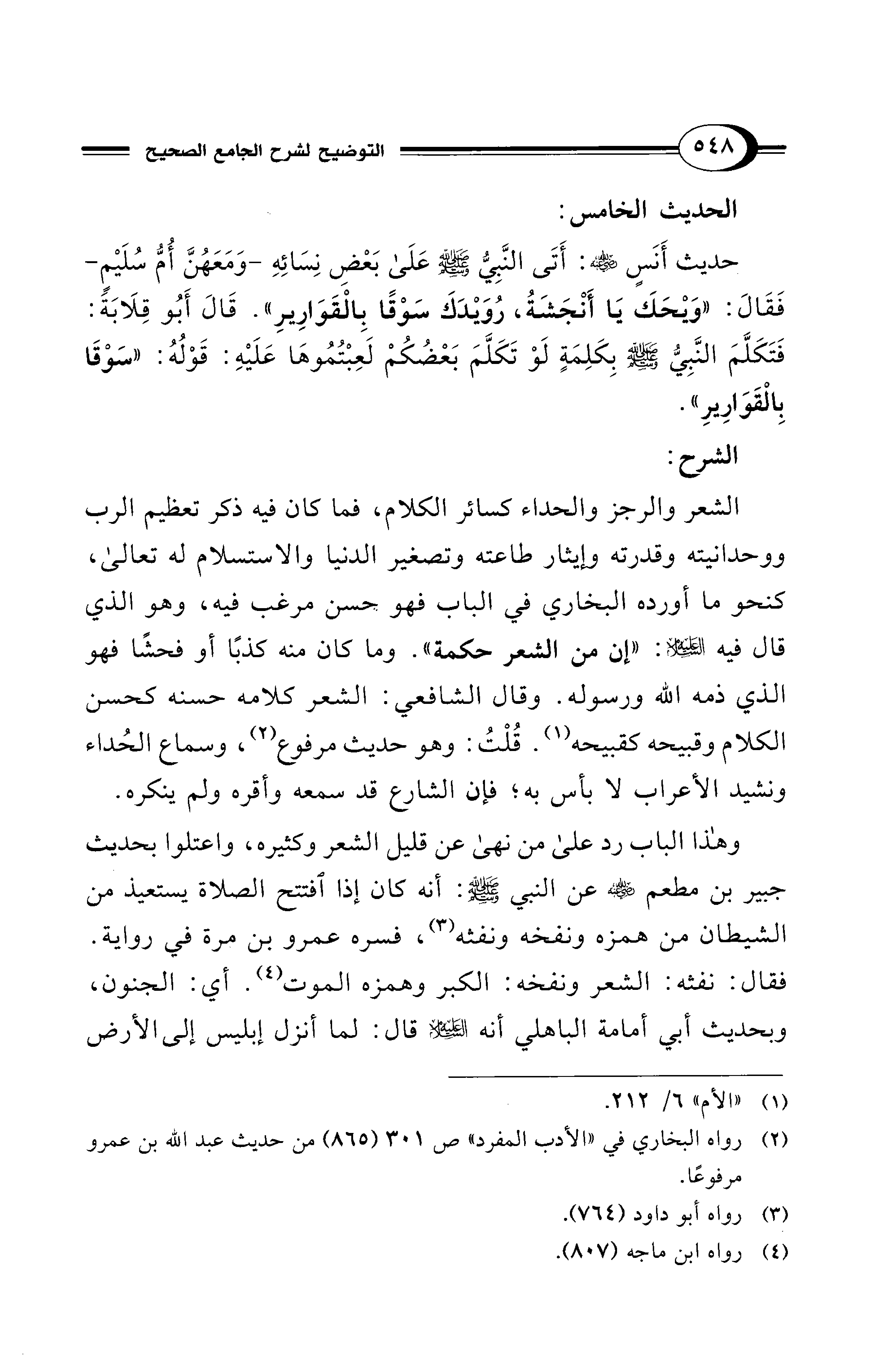 حديث أَنَسٍ - رضي الله عنه -: أَتَى النَّبِيُّ - صلى الله عليه وسلم - عَلَى بَعْضِ نِسَائِهِ -وَمَعَهُنَّ أُمُّ سُلَيْمٍ- فَقَالَ: "وَيْحَكَ يَا أَنْجَشَةُ، رُوَيْدَكَ سَوْقًا بِالْقَوَارِيرِ". قَالَ أَبُو قِلَابَةَ: فَتَكَلَّمَ النَّبِيُّ - صلى الله عليه وسلم - بِكَلِمَةٍ لَوْ تَكَلَّمَ بَعْضُكُمْ لَعِبْتُمُوهَا عَلَيْهِ: قَوْلُهُ: "سَوْقَا بِالْقَوَارِيرِ".