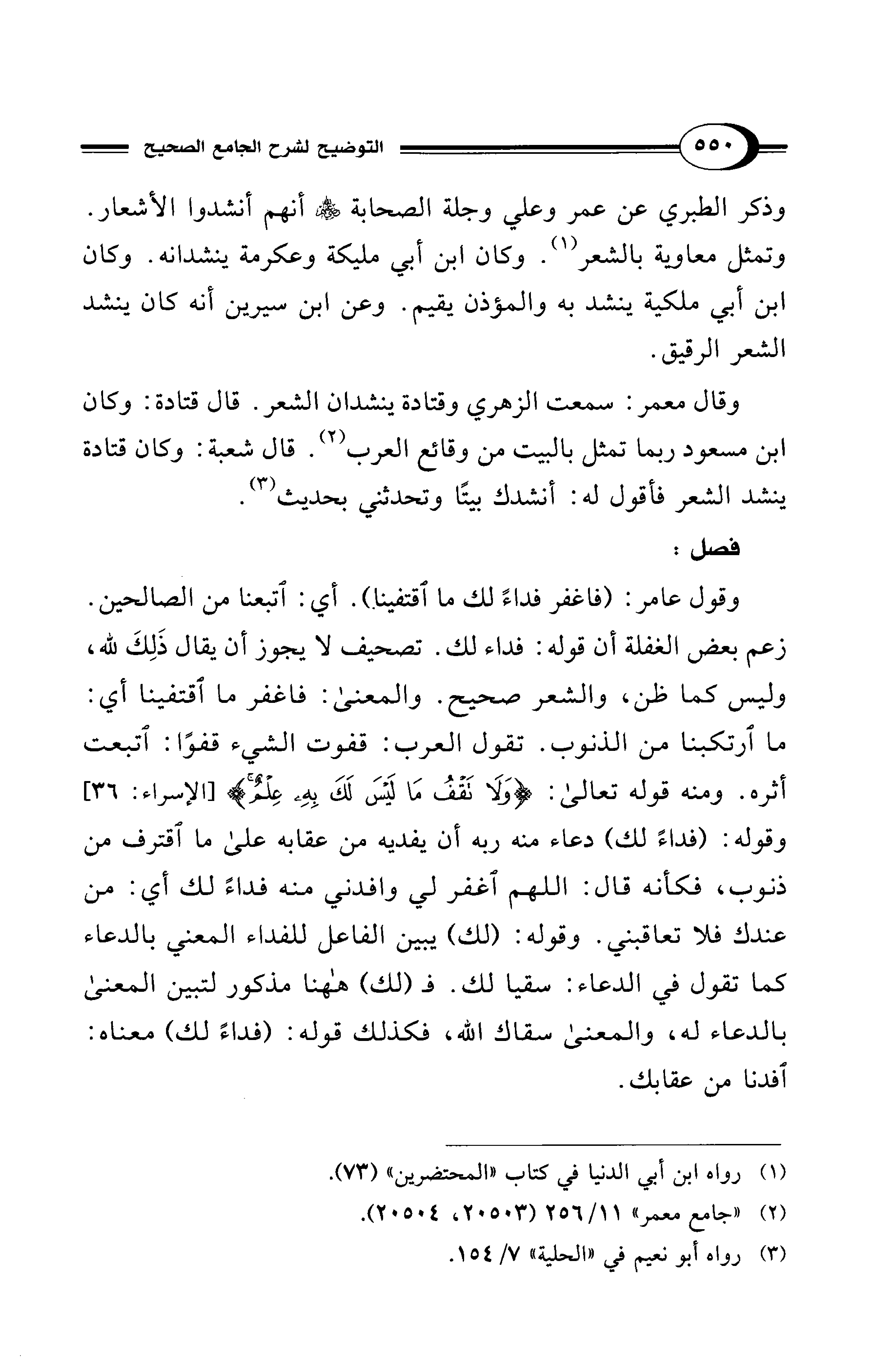 وذكر الطبري عن عمر وعلي وجلة الصحابة - رضي الله عنهم - أنهم أنشدوا الأشعار. وتمثل معاوية بالشعر (¬1). وكان ابن أبي مليكة وعكرمة ينشدانه. وكان ابن أبي ملكية ينشد به والمؤذن يقيم. وعن ابن سيرين أنه كان ينشد الشعر الرقيق.