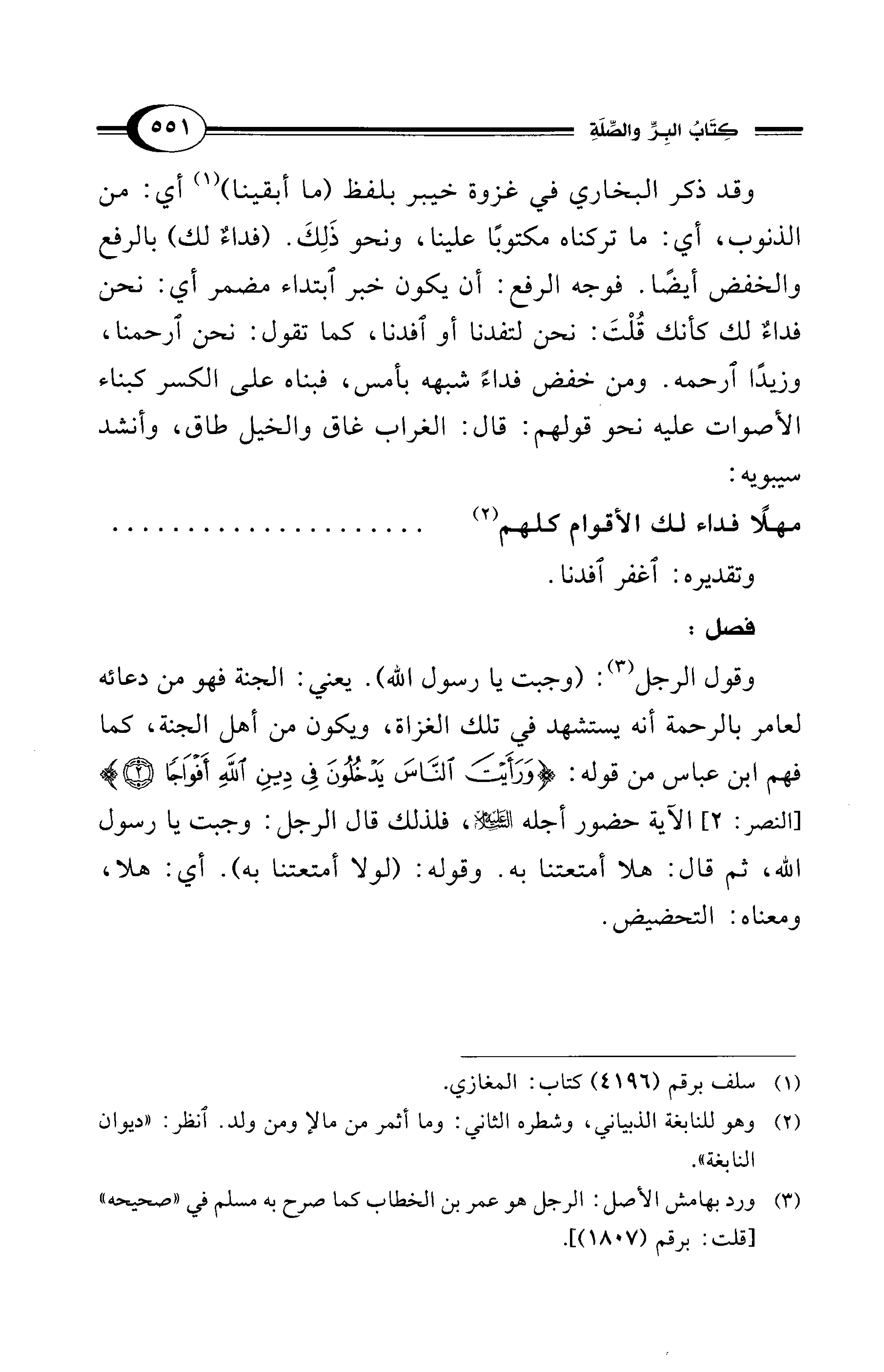 وقد ذكر البخاري في غزوة خيبر بلفظ (ما أبقينا) (¬1) أي: من الذنوب، أي: ما تركناه مكتوبًا علينا، ونحو ذَلِكَ. (فداءٌ لك) بالرفع والخفض أيضًا. فوجه الرفع: أن يكون خبر ابتداء مضمر أي: نحن فداءٌ لك كأنك قُلْتَ: نحن لتفدنا أو افدنا، كما تقول: نحن ارحمنا، وزيدًا ارحمه. ومن خفض فداءً شبهه بأمس، فبناه على الكسر كبناء الأصوات عليه نحو قولهم: قال: الغراب غاق والخيل طاق، وأنشد سيبويه: