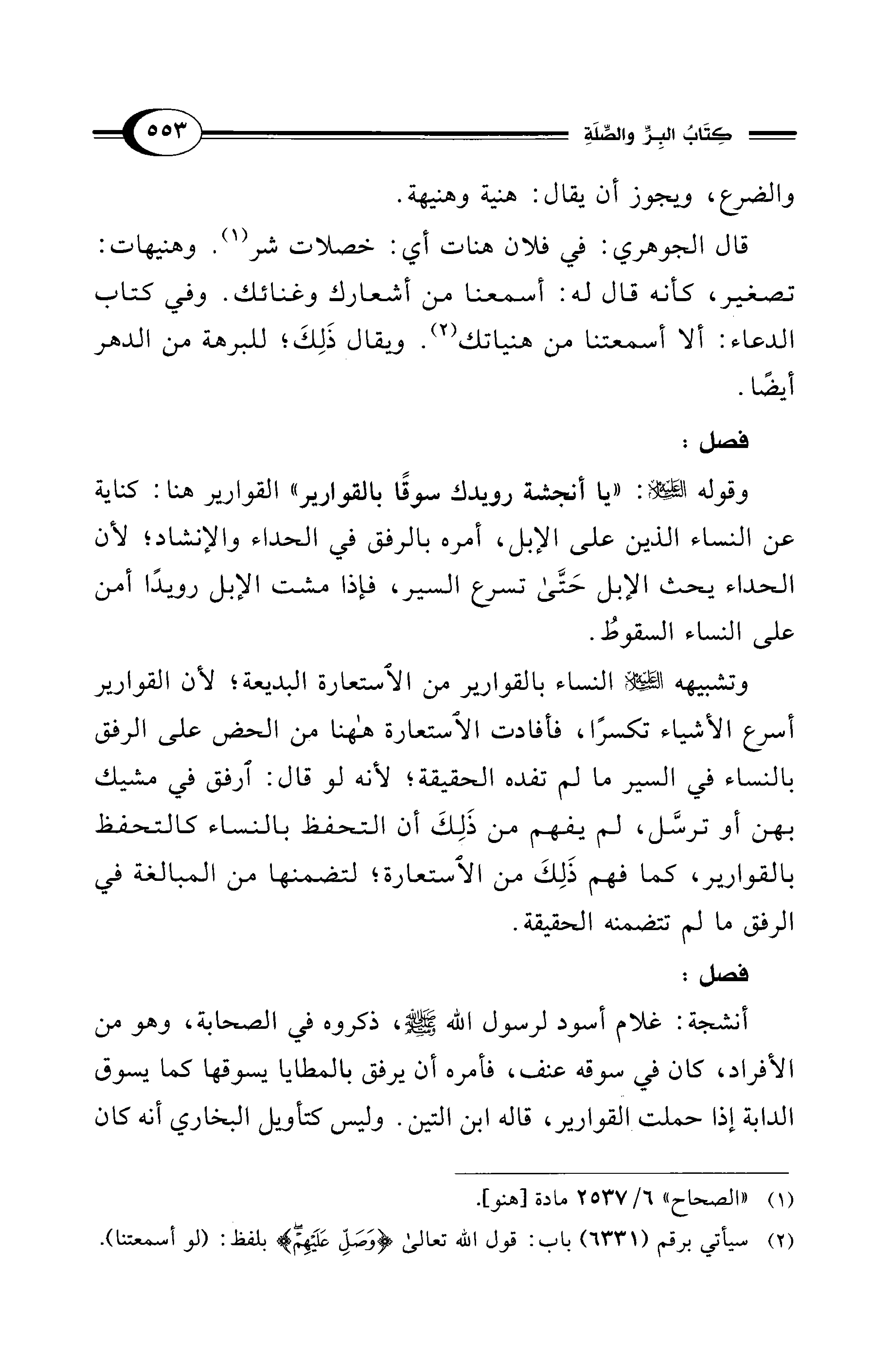 وقوله - عليه السلام -: "يا أنجشة رويدك سوقًا بالقوارير" القوارير هنا: كناية عن النساء الذين على الإبل، أمره بالرفق في الحداء والإنشاد؛ لأن الحداء يحث الإبل حَتَّى تسرع السير، فإذا مشت الإبل رويدًا أمن على النساء السقوطُ.