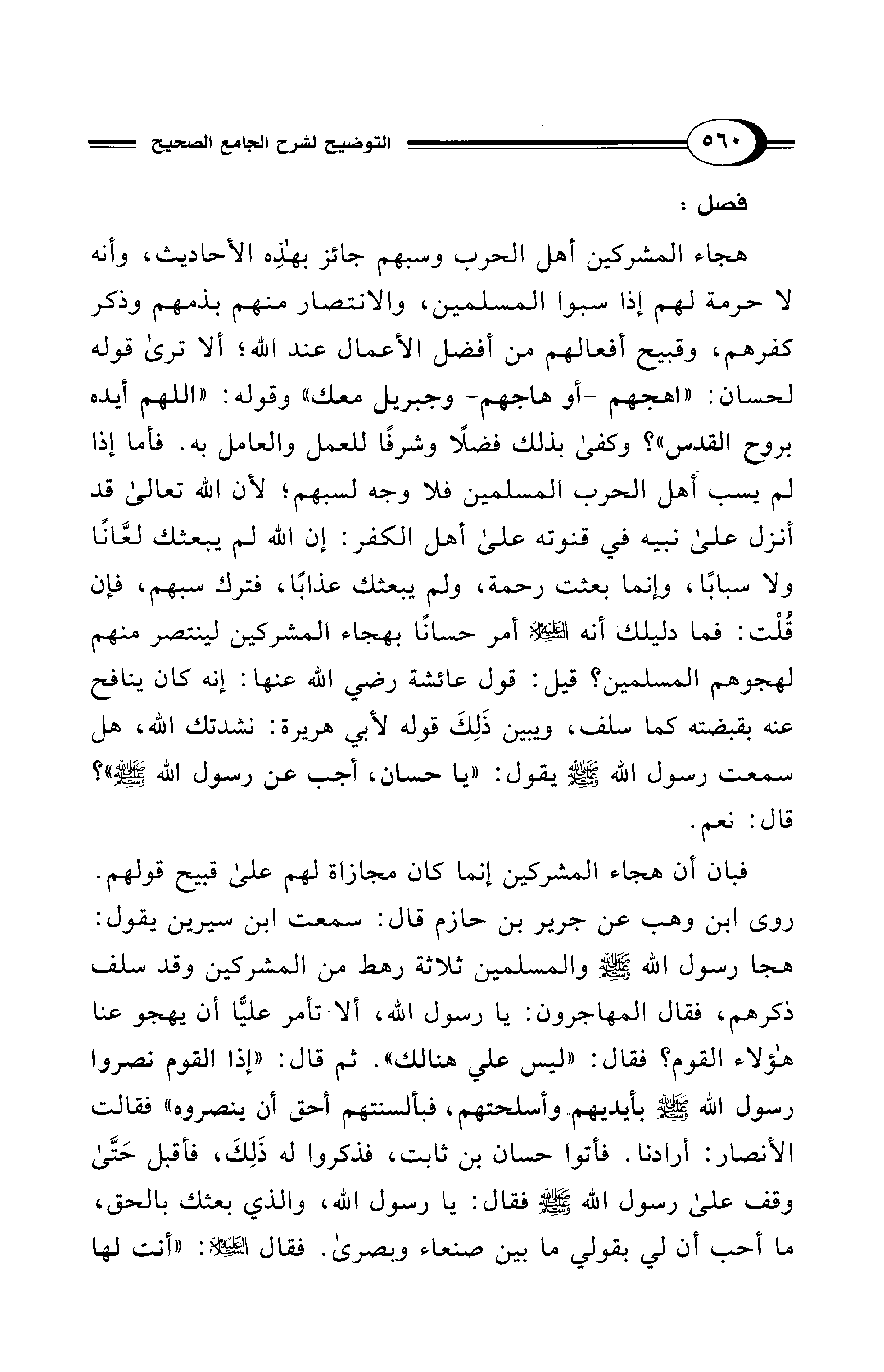 هجاء المشركين أهل الحرب وسبهم جائز بهذِه الأحاديث، وأنه لا حرمة لهم إذا سبوا المسلمين، والانتصار منهم بذمهم وذكر كفرهم، وقبيح أفعالهم من أفضل الأعمال عند الله؛ ألا ترى قوله لحسان: "اهجهم -أو هاجهم- وجبريل معك" وقوله: "اللهم أيده بروح القدس"؟ وكفى بذلك فضلاً وشرفًا للعمل والعامل به. فأما إذا لم يسب أهل الحرب المسلمين فلا وجه لسبهم؛ لأن الله تعالى قد أنزل على نبيه في قنوته على أهل الكفر: إن الله لم يبعثك لعَّانًا ولا سبابًا، وإنما بعثت رحمة، ولم يبعثك عذابًا، فترك سبهم، فإن قُلْت: فما دليلك أنه - عليه السلام - أمر حسانًا بهجاء المشركين لينتصر منهم لهجوهم المسلمين؟ قيل: قول عائشة - رضي الله عنها -: إنه كان ينافح عنه بقبضته كما سلف، ويبين ذَلِكَ قوله لأبي هريرة: نشدتك الله، هل سمعت رسول الله - صلى الله عليه وسلم - يقول: "يا حسان، أحب عن رسول الله - صلى الله عليه وسلم -"؟ قال: نعم.