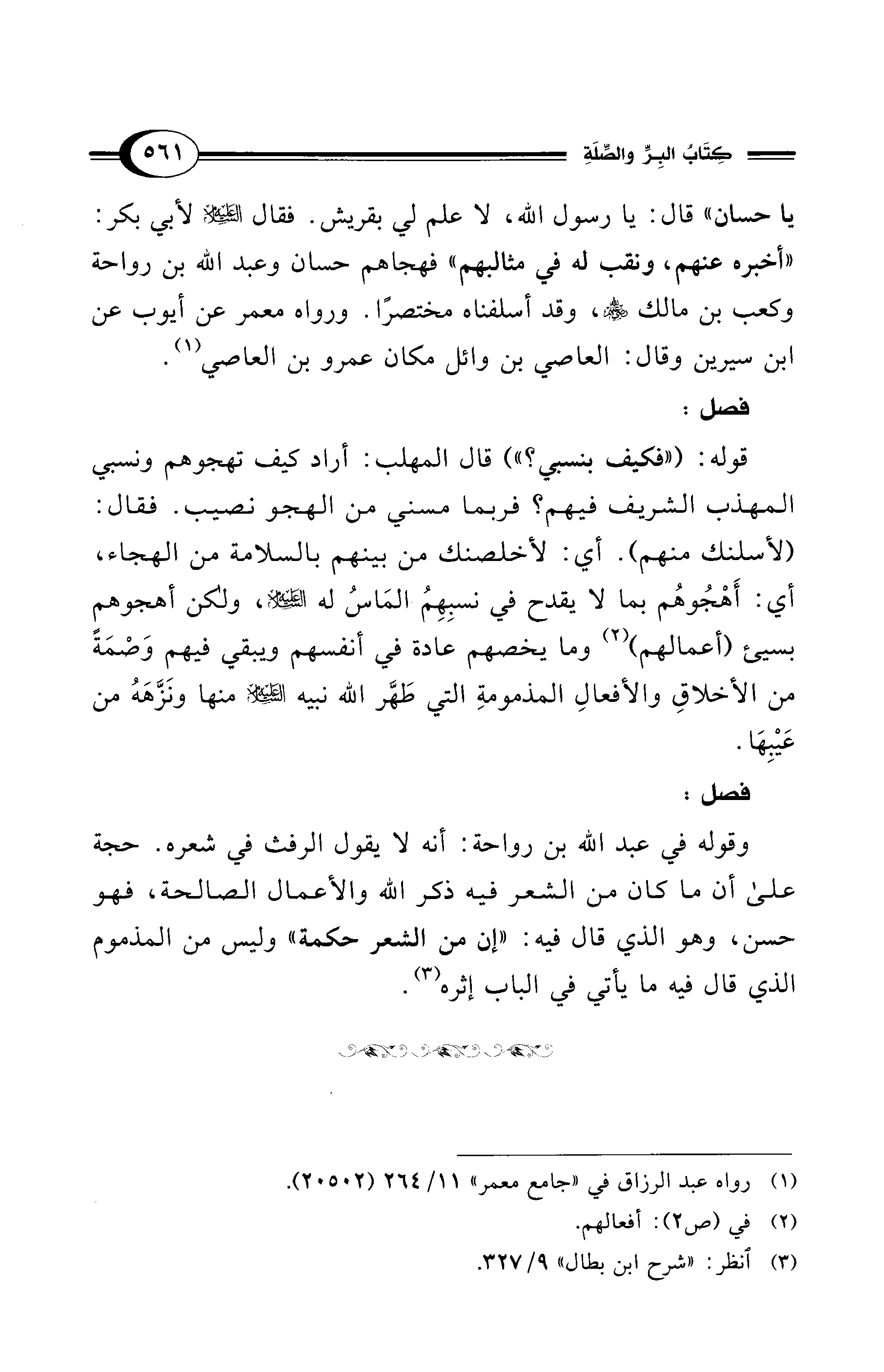وقوله في عبد الله بن رواحة: أنه لا يقول الرفث في شعره. حجة على أن ما كان من الشعر فيه ذكر الله والأعمال الصالحة، فهو حسن، وهو الذي قال فيه: "إن من الشعر حكمة" وليس من المذموم الذي قال فيه ما يأتي في الباب إثره (¬3).