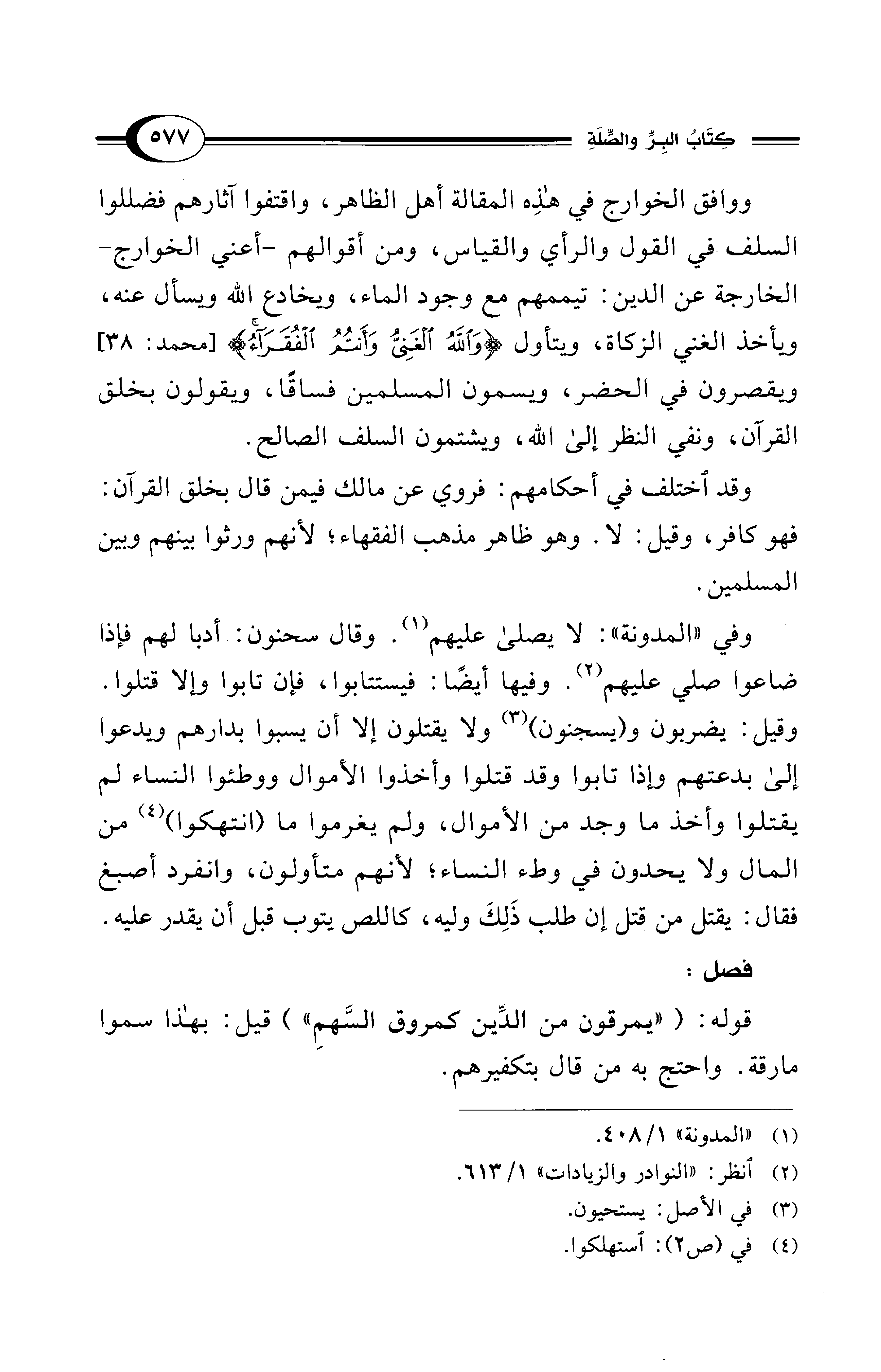 ووافق الخوارج في هذِه المقالة أهل الظاهر، واقتفوا آثارهم فضللوا السلف في القول والرأي والقياس، ومن أقوالهم -أعني الخوارج- الخارجة عن الدين: تيممهم مع وجود الماء، ويخادع الله ويسأل عنه، ويأخذ الغني الزكاة، ويتأول {وَاللهُ الْغَنِيُّ وَأَنْتُمُ الْفُقَرَاءُ} [محمد: 38] ويقصرون في الحضر، ويسمون المسلمين فساقًا، ويقولون بخلق القرآن، ونفي النظر إلى الله، ويشتمون السلف الصالح.