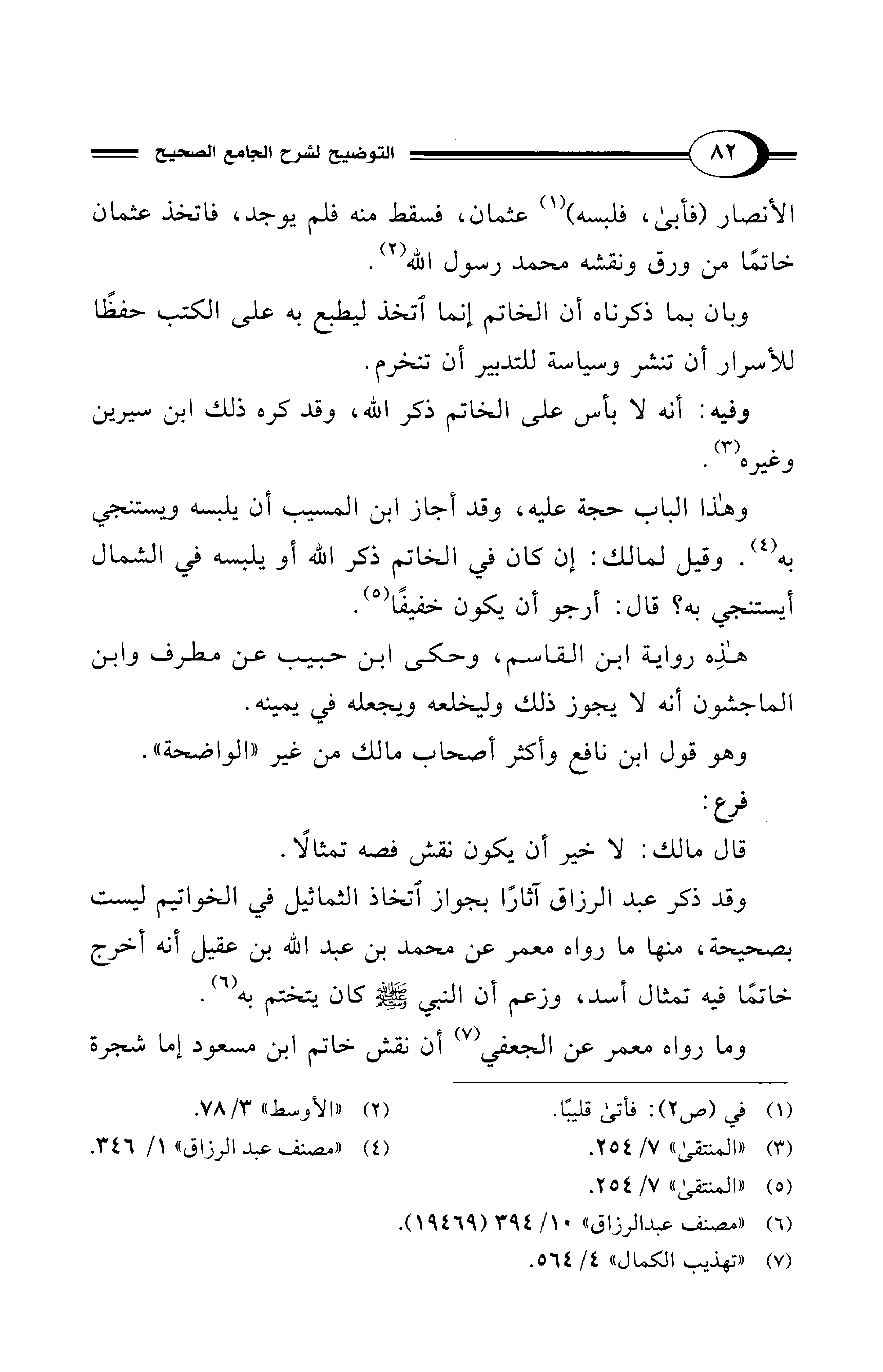 وقد ذكر عبد الرزاق آثارًا بجواز اتخاذ الثماثيل في الخواتيم ليست بصحيحة، منها ما رواه معمر عن محمد بن عبد الله بن عقيل أنه أخرج خاتمًا فيه تمثال أسد، وزعم أن النبي - صلى الله عليه وسلم - كان يتختم به (¬6).