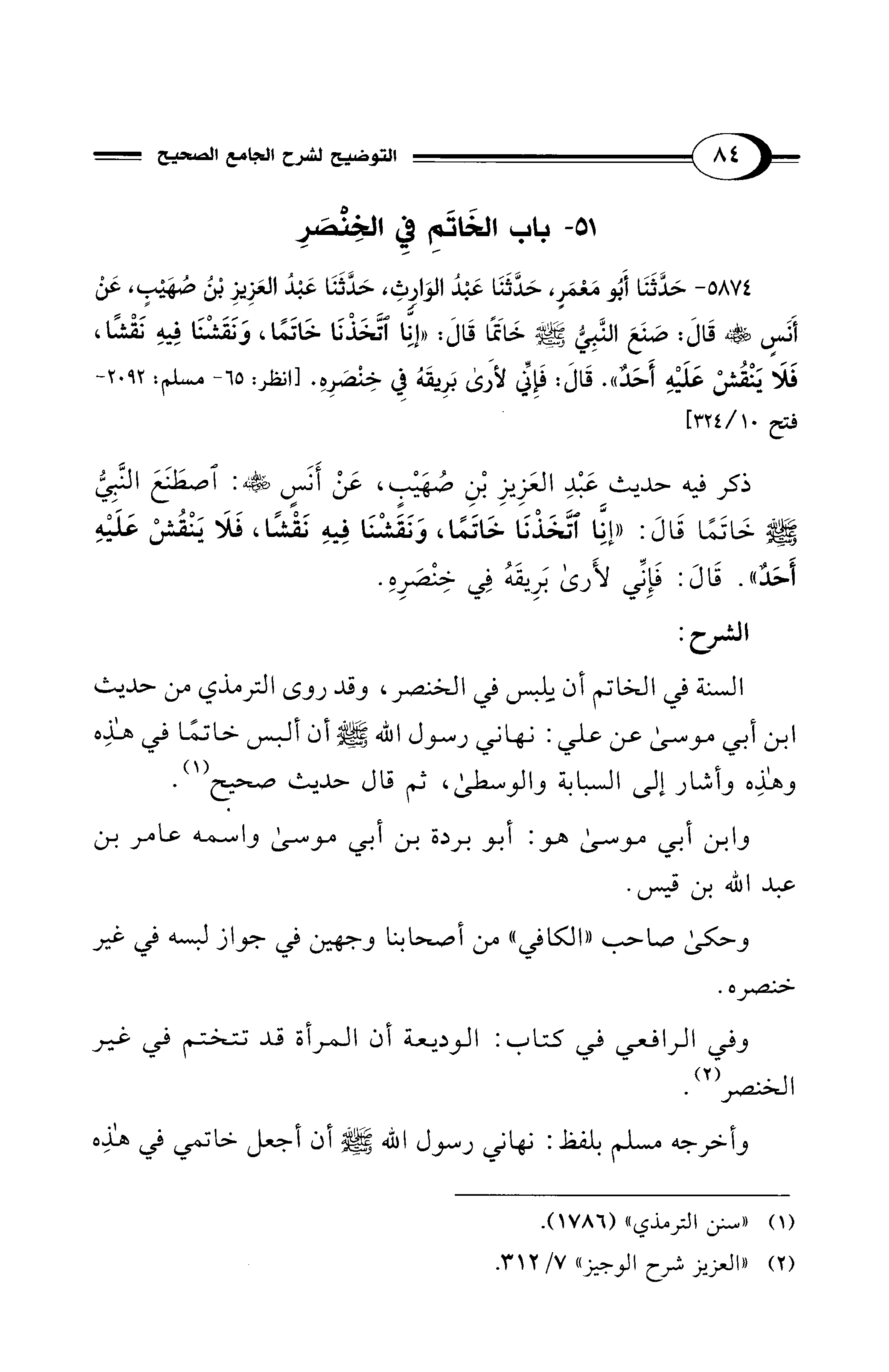 5874 - حَدَّثَنَا أَبُو مَعْمَرٍ، حَدَّثَنَا عَبْدُ الْوَارِثِ، حَدَّثَنَا عَبْدُ الْعَزِيزِ بْنُ صُهَيْبٍ، عَنْ أَنَسٍ - رضي الله عنه - قَالَ: صَنَعَ النَّبِيُّ - صلى الله عليه وسلم - خَاتَمًا قَالَ: «إِنَّا اتَّخَذْنَا خَاتَمًا، وَنَقَشْنَا فِيهِ نَقْشًا، فَلاَ يَنْقُشْ عَلَيْهِ أَحَدٌ». قَالَ: فَإِنِّي لأَرَى بَرِيقَهُ فِي خِنْصَرِهِ. [انظر: 65 - مسلم: 2092 - فتح 10/ 324]