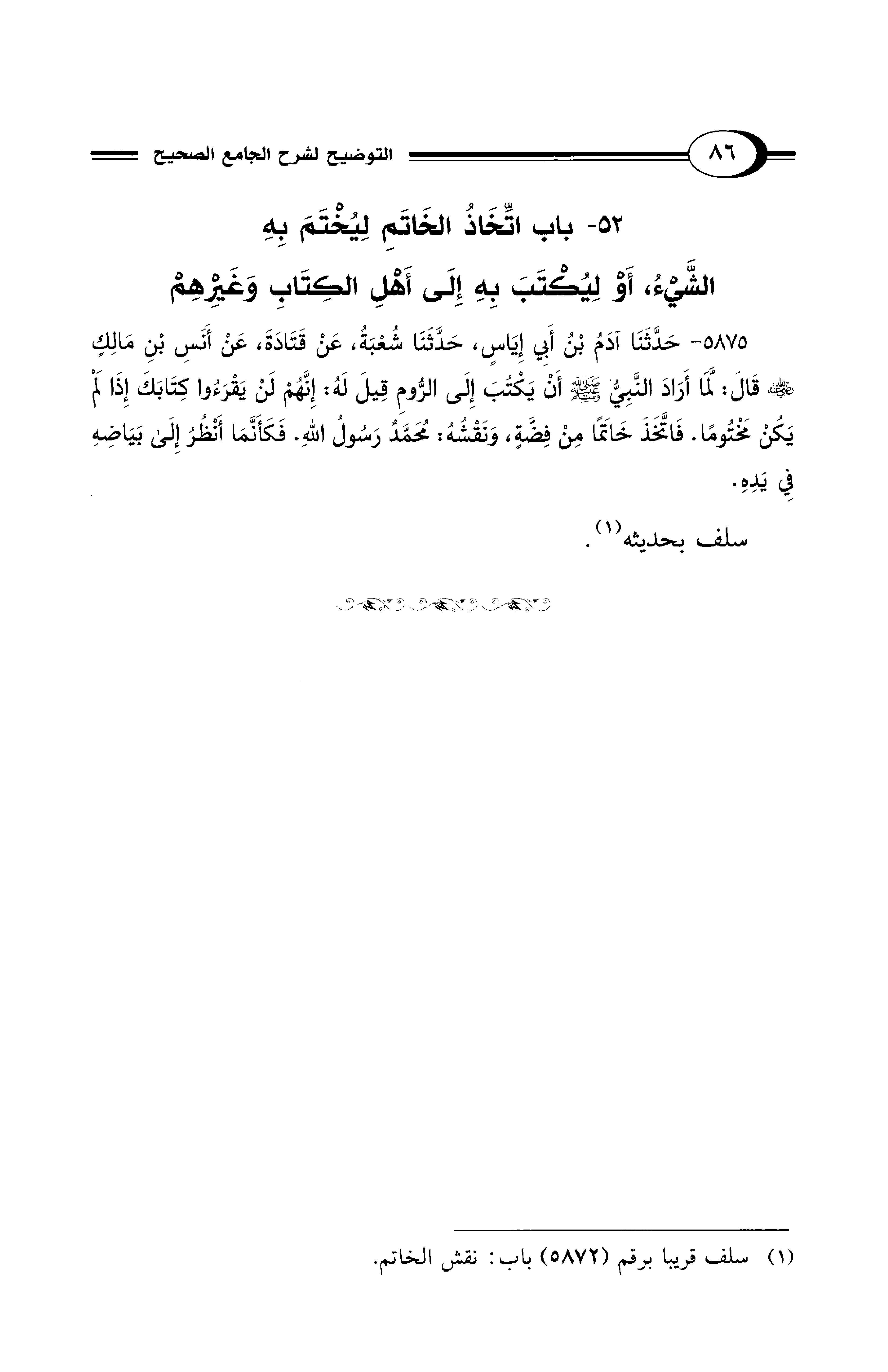 5875 - حَدَّثَنَا آدَمُ بْنُ أَبِي إِيَاسٍ، حَدَّثَنَا شُعْبَةُ، عَنْ قَتَادَةَ، عَنْ أَنَسِ بْنِ مَالِكٍ - رضي الله عنه - قَالَ: لَمَّا أَرَادَ النَّبِيُّ - صلى الله عليه وسلم - أَنْ يَكْتُبَ إِلَى الرُّومِ قِيلَ لَهُ: إِنَّهُمْ لَنْ يَقْرَءُوا كِتَابَكَ إِذَا لَمْ يَكُنْ مَخْتُومًا. فَاتَّخَذَ خَاتَمًا مِنْ فِضَّةٍ، وَنَقْشُهُ: مُحَمَّدٌ رَسُولُ اللهِ. فَكَأَنَّمَا أَنْظُرُ إِلَى بَيَاضِهِ فِي يَدِهِ.