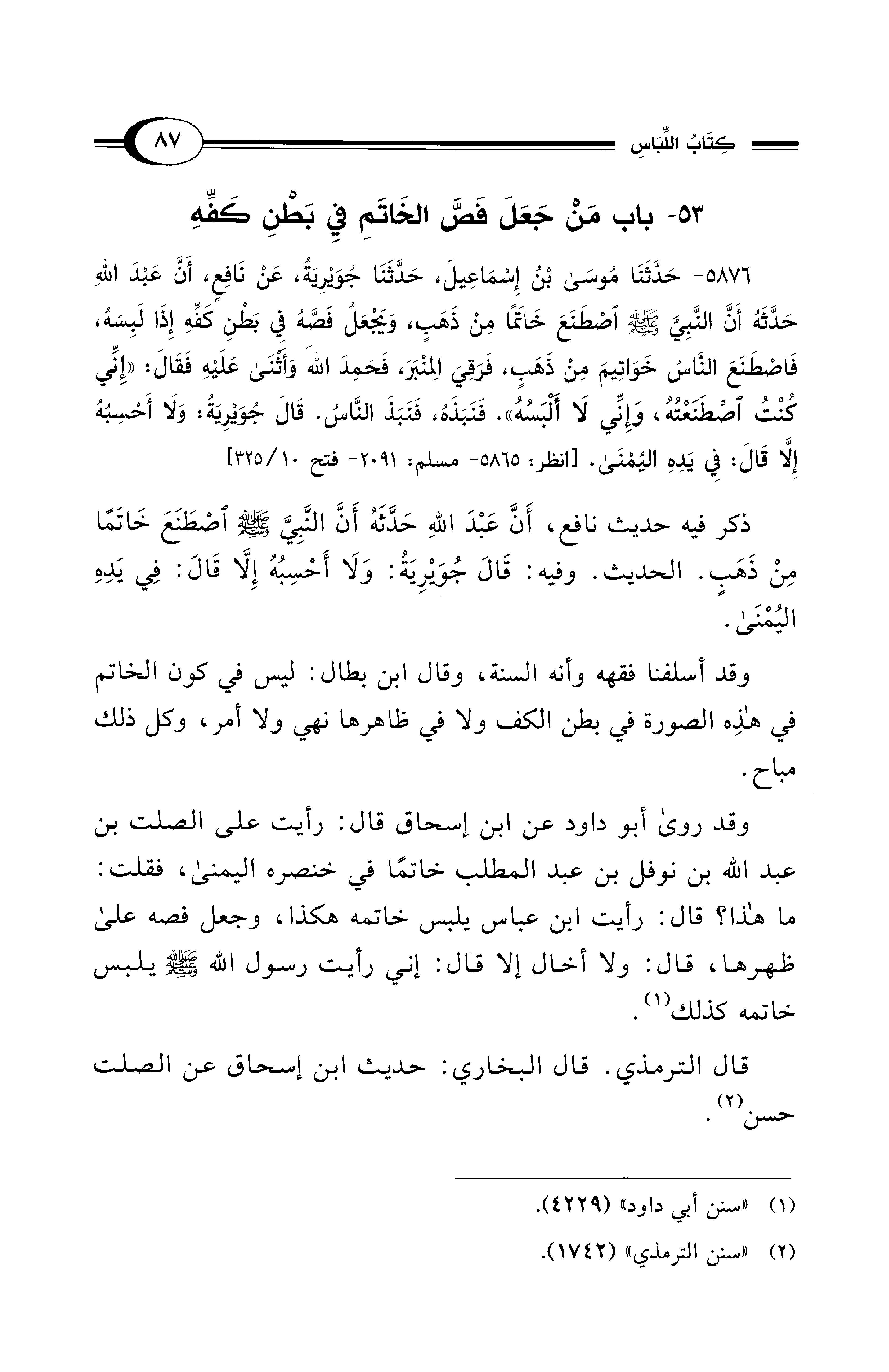 5876 - حَدَّثَنَا مُوسَى بْنُ إِسْمَاعِيلَ، حَدَّثَنَا جُوَيْرِيَةُ، عَنْ نَافِعٍ، أَنَّ عَبْدَ اللهِ حَدَّثَهُ أَنَّ النَّبِيَّ - صلى الله عليه وسلم - اصْطَنَعَ خَاتَمًا مِنْ ذَهَبٍ، جَعَلَ فَصَّهُ فِي بَطْنِ كَفِّهِ إِذَا لَبِسَهُ، فَاصْطَنَعَ النَّاسُ خَوَاتِيمَ مِنْ ذَهَبٍ، فَرَقِيَ الْمِنْبَرَ، فَحَمِدَ اللهَ وَأَثْنَى عَلَيْهِ فَقَالَ: «إِنِّي كُنْتُ اصْطَنَعْتُهُ، وَإِنِّي لاَ أَلْبَسُهُ». فَنَبَذَهُ، فَنَبَذَ النَّاسُ. قَالَ جُوَيْرِيَةُ: وَلاَ أَحْسِبُهُ إِلاَّ قَالَ: فِي يَدِهِ الْيُمْنَى. [انظر: 5865 - مسلم: 2091 - فتح 10/ 325]
