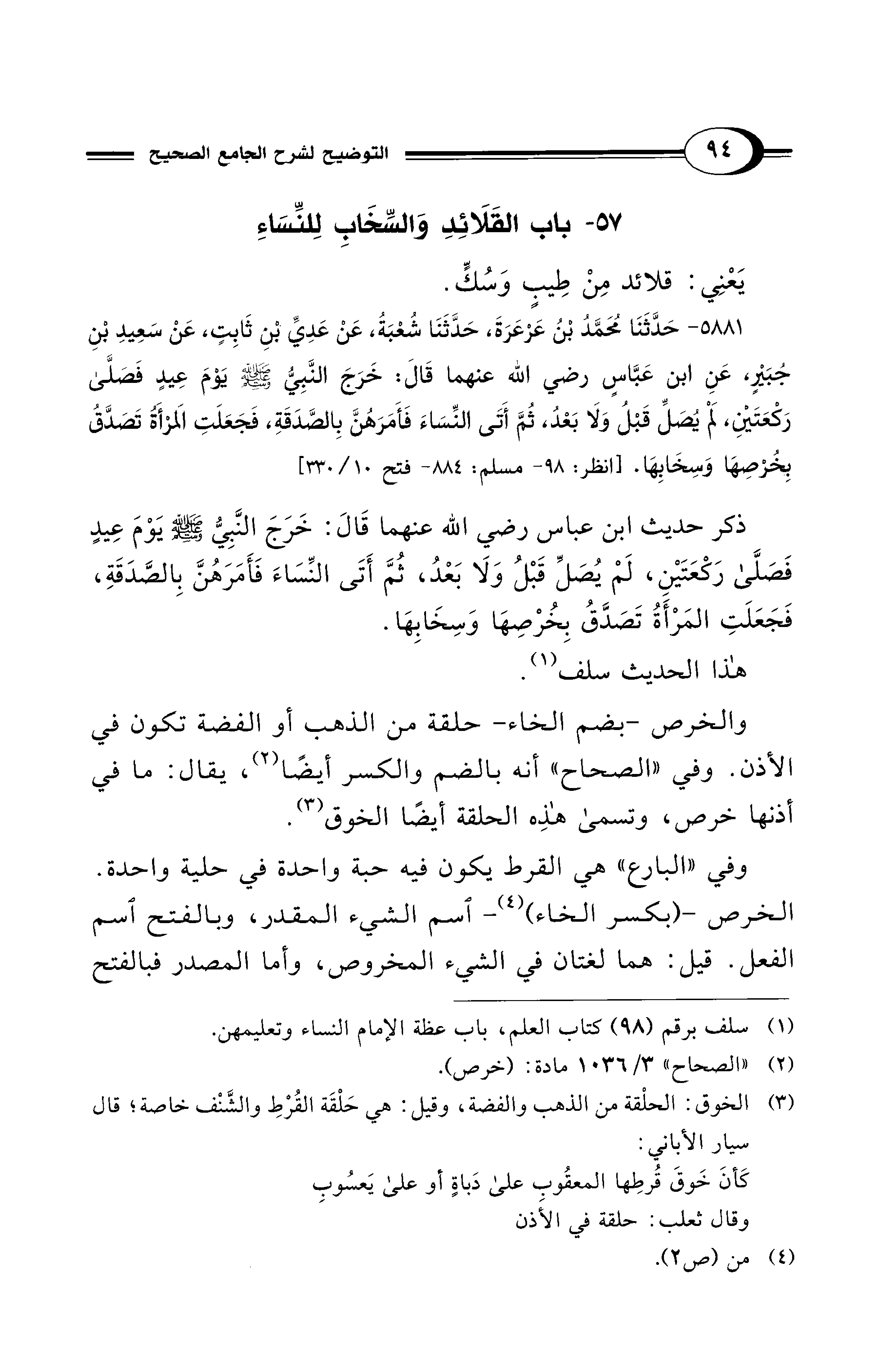 5881 - حَدَّثَنَا مُحَمَّدُ بْنُ عَرْعَرَةَ، حَدَّثَنَا شُعْبَةُ، عَنْ عَدِيِّ بْنِ ثَابِتٍ، عَنْ سَعِيدِ بْنِ جُبَيْرٍ، عَنِ ابْنِ عَبَّاسٍ - رضي الله عنهما - قَالَ: خَرَجَ النَّبِيُّ - صلى الله عليه وسلم - يَوْمَ عِيدٍ فَصَلَّى رَكْعَتَيْنِ، لَمْ يُصَلِّ قَبْلُ وَلاَ بَعْدُ، ثُمَّ أَتَى النِّسَاءَ فَأَمَرَهُنَّ بِالصَّدَقَةِ، فَجَعَلَتِ المَرْأَةُ تَصَدَّقُ بِخُرْصِهَا وَسِخَابِهَا. [انظر: 98 - مسلم: 884 - فتح 10/ 330]