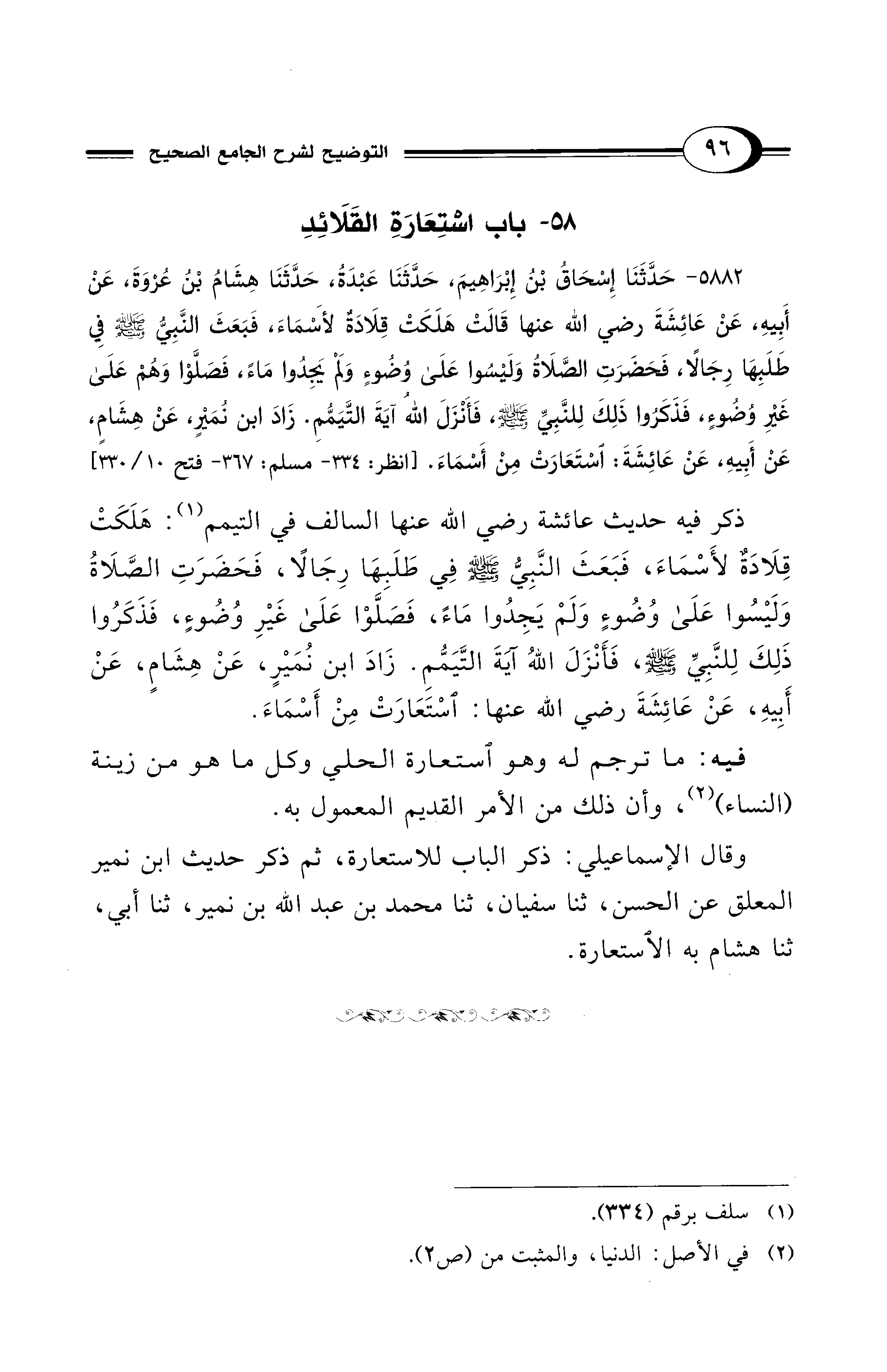 5882 - حَدَّثَنَا إِسْحَاقُ بْنُ إِبْرَاهِيمَ، حَدَّثَنَا عَبْدَةُ، حَدَّثَنَا هِشَامُ بْنُ عُرْوَةَ، عَنْ أَبِيهِ، عَنْ عَائِشَةَ - رضي الله عنها - قَالَتْ هَلَكَتْ قِلاَدَةٌ لأَسْمَاءَ، فَبَعَثَ النَّبِيُّ - صلى الله عليه وسلم - فِي طَلَبِهَا رِجَالاً، فَحَضَرَتِ الصَّلاَةُ وَلَيْسُوا عَلَى وُضُوءٍ وَلَمْ يَجِدُوا مَاءً، فَصَلَّوْا وَهُمْ عَلَى غَيْرِ وُضُوءٍ، فَذَكَرُوا ذَلِكَ لِلنَّبِيِّ - صلى الله عليه وسلم -، فَأَنْزَلَ اللهُ آيَةَ التَّيَمُّمِ. زَادَ ابْنُ نُمَيْرٍ، عَنْ هِشَامٍ، عَنْ أَبِيهِ، عَنْ عَائِشَةَ: اسْتَعَارَتْ مِنْ أَسْمَاءَ. [انظر: 334 - مسلم: 367 - فتح 10/ 330]