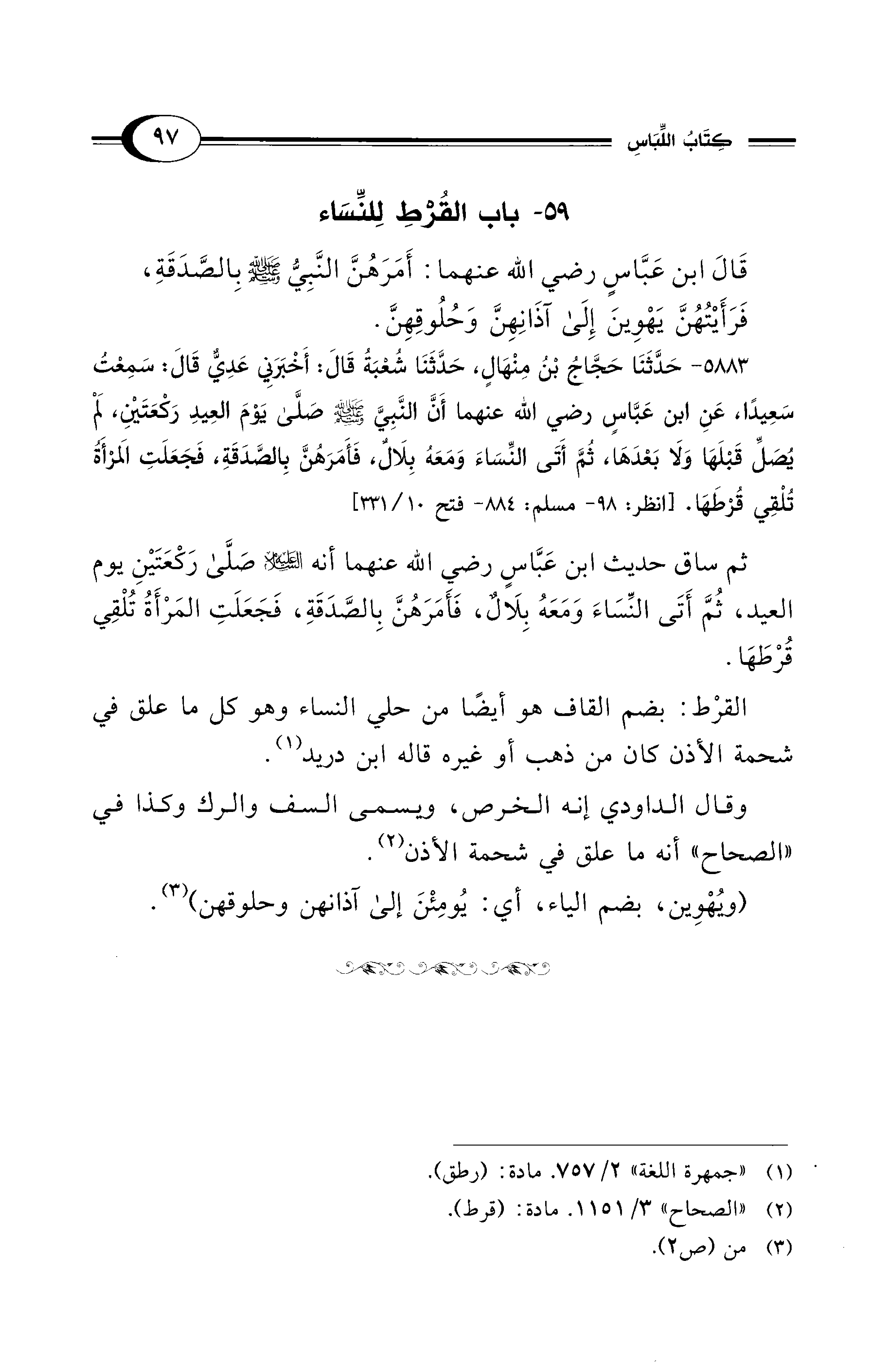 5883 - حَدَّثَنَا حَجَّاجُ بْنُ مِنْهَالٍ، حَدَّثَنَا شُعْبَةُ قَالَ: أَخْبَرَنِي عَدِيٌّ قَالَ: سَمِعْتُ سَعِيدًا، عَنِ ابْنِ عَبَّاسٍ - رضي الله عنهما - أَنَّ النَّبِيَّ - صلى الله عليه وسلم - صَلَّى يَوْمَ الْعِيدِ رَكْعَتَيْنِ، لَمْ يُصَلِّ قَبْلَهَا وَلاَ بَعْدَهَا، ثُمَّ أَتَى النِّسَاءَ وَمَعَهُ بِلاَلٌ، فَأَمَرَهُنَّ بِالصَّدَقَةِ، فَجَعَلَتِ الْمَرْأَةُ تُلْقِي قُرْطَهَا. [انظر: 98 - مسلم: 884 - فتح 10/ 331]