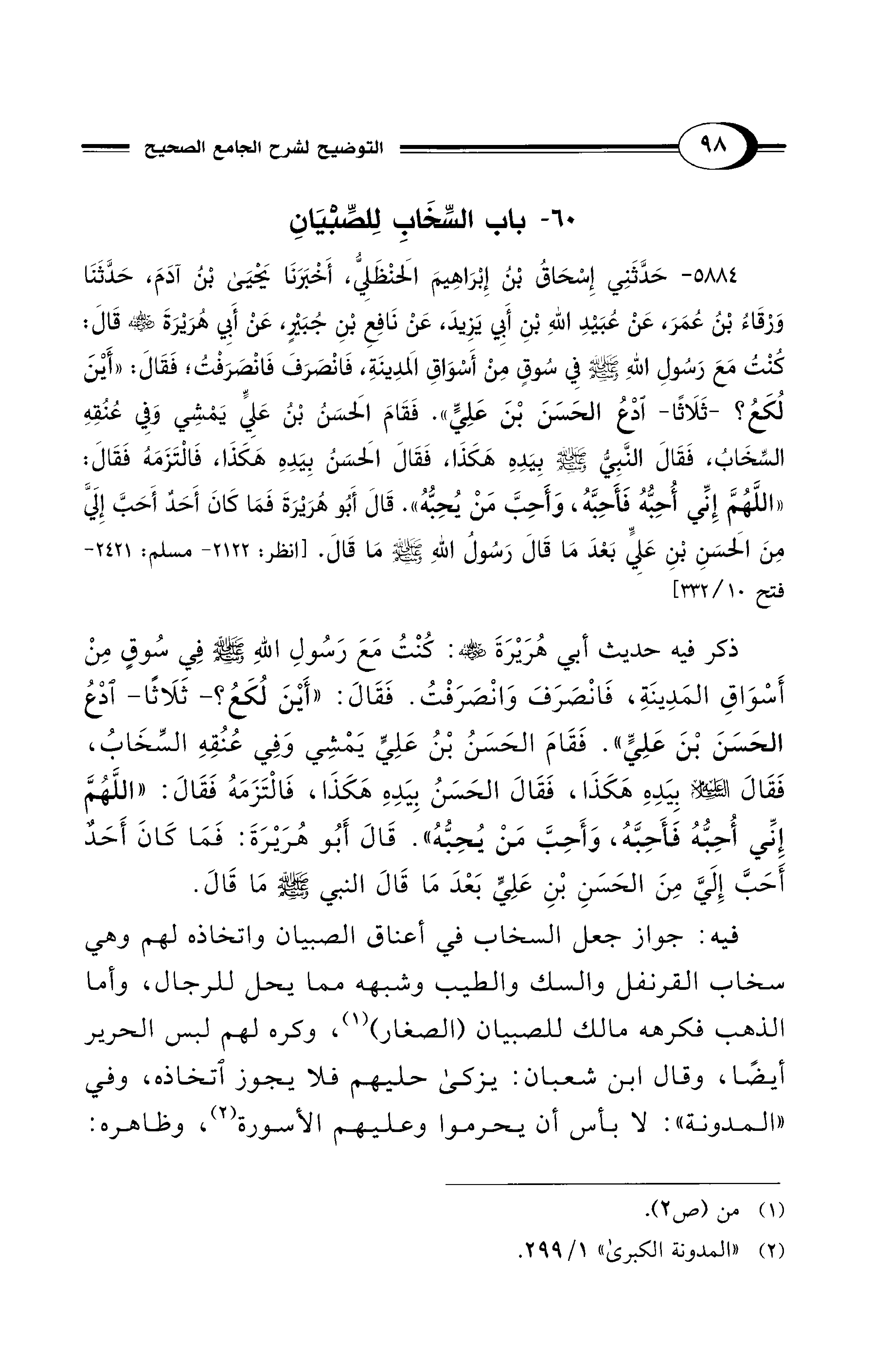 5884 - حَدَّثَنِي إِسْحَاقُ بْنُ إِبْرَاهِيمَ الحَنْظَلِيُّ، أَخْبَرَنَا يَحْيَى بْنُ آدَمَ، حَدَّثَنَا وَرْقَاءُ بْنُ عُمَرَ، عَنْ عُبَيْدِ اللهِ بْنِ أَبِي يَزِيدَ، عَنْ نَافِعِ بْنِ جُبَيْرٍ، عَنْ أَبِي هُرَيْرَةَ - رضي الله عنه - قَالَ: كُنْتُ مَعَ رَسُولِ اللهِ - صلى الله عليه وسلم - فِي سُوقٍ مِنْ أَسْوَاقِ الْمَدِينَةِ، فَانْصَرَفَ فَانْصَرَفْتُ؛ فَقَالَ: «أَيْنَ لُكَعُ؟ -ثَلاَثًا- ادْعُ الْحَسَنَ بْنَ عَلِيٍّ». فَقَامَ الْحَسَنُ بْنُ عَلِيٍّ يَمْشِي وَفِي عُنُقِهِ السِّخَابُ، فَقَالَ النَّبِيُّ - صلى الله عليه وسلم - بِيَدِهِ هَكَذَا، فَقَالَ الحَسَنُ بِيَدِهِ هَكَذَا، فَالْتَزَمَهُ فَقَالَ: «اللَّهُمَّ إِنِّي أُحِبُّهُ فَأَحِبَّهُ، وَأَحِبَّ مَنْ يُحِبُّهُ». قَالَ أَبُو هُرَيْرَةَ فَمَا كَانَ أَحَدٌ أَحَبَّ إِلَيَّ مِنَ الحَسَنِ بْنِ عَلِيٍّ بَعْدَ مَا قَالَ رَسُولُ اللهِ - صلى الله عليه وسلم - مَا قَالَ. [انظر: 2122 - مسلم: 2421 - فتح 10/ 332]