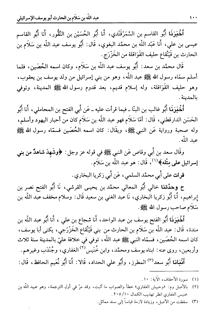 أخبرنا أبو القاسم بن السمرقندي أنا أبو الحسين بن النقور أنا أبو القاسم عيسى بن علي أنا عبد الله بن محمد البغوي قال أبو يوسف عبد الله بن سلام بن الحارث بن قينقاع حليف القواقلة من الخزرج قال محمد بن سعد أبو يوسف عبد الله بن سلام وكان اسمه الحصين فلما أسلم سماه رسول الله (صلى الله عليه وسلم) عبد الله وهو من بني إسرائيل من ولد يوسف بن يعقوب وهو حليف القواقلة وله إسلام قديم بعد قدوم رسول الله (صلى الله عليه وسلم) المدينة وتوفي بالمدينة أخبرنا أبو غالب بن البنا فيما قرأت عليه عن أبي الفتح بن المحاملي أنا أبو الحسن الدارقطني قال أما سلام فهو عبد الله بن سلام كان من أحبار اليهود وأسلم وله صحبة ورواية عن النبي (صلى الله عليه وسلم) ويقال كان اسمه الحصين فسماه رسول الله (صلى الله عليه وسلم) عبد الله وقال سعد بن أبي وقاص عن النبي (صلى الله عليه وسلم) في قوله عز وجل " وشهد شاهد من بني إسرائيل على مثله " (1) قال هو عبد الله بن سلام قرأت على أبي محمد السلمي عن أبي زكريا البخاري ح وحدثنا خالي أبو المعالي محمد بن يحيى القرشي نا أبو الفتح نصر بن إبراهيم أنا أبو زكريا البخاري نا عبد الغني بن سعيد قال وسلام مخفف عبد الله بن سلام صاحب رسول الله (صلى الله عليه وسلم) أخبرنا أبو الفتح يوسف بن عبد الواحد أنا شجاع بن علي أنا أبو عبد الله بن مندة قال عبد الله بن سلام بن الحارث من بني قينقاع الخزرجي يكنى أبا يوسف كان اسمه الحصين فسماه النبي (صلى الله عليه وسلم) عبد الله توفي في خلافة علي بالمدينة سنة ثلاث وأربعين روى عنه ابناه يوسف ومحمد وابن خنيس (2) الغفاري وجندب وغيرهم أنبأنا أبو سعد (3) المطرز وأبو علي الحداد قالا أنا أبو نعيم الحافظ قال