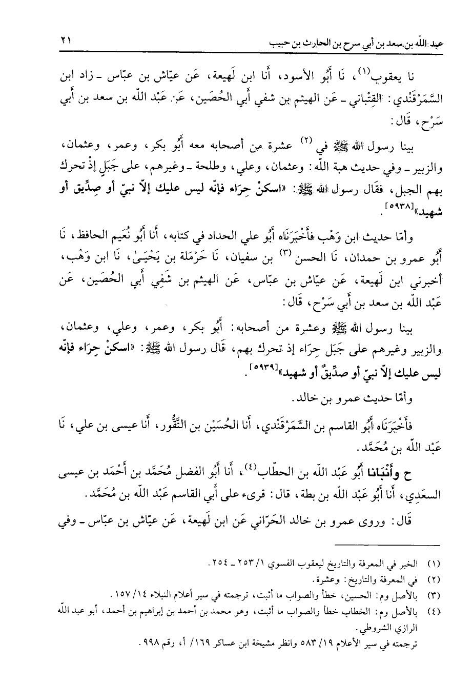 نا يعقوب (1) نا أبو الأسود أنا ابن لهيعة عن عياش بن عباس زاد ابن السمرقندي القتباني عن الهيثم بن شفي أبي الحصين عن عبد الله بن سعد بن أبي سرح قال بينا رسول الله (صلى الله عليه وسلم) في (2) عشرة من أصحابه معه أبو بكر وعمر وعثمان والزبير وفي حديث هبة الله وعثمان وعلي وطلحة وغيرهم على جبل إذ تحرك بهم الجبل فقال رسول الله (صلى الله عليه وسلم) اسكن حراء فإنه ليس عليك إلا نبي أو صديق أو شهيد