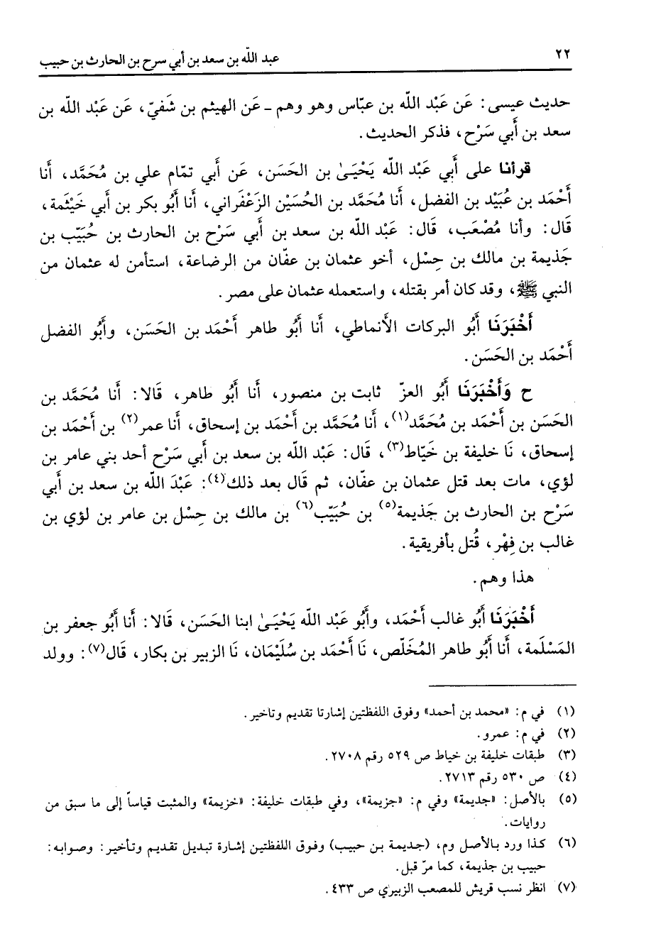 حديث عيسى عن عبد الله بن عباس وهو وهم عن الهيثم بن شفي عن عبد الله بن سعد بن أبي سرح فذكر الحديث قرأنا على أبي عبد الله يحيى بن الحسن عن أبي تمام علي بن محمد أنا أحمد بن عبيد بن الفضل أنا محمد بن الحسين الزعفراني أنا أبو بكر بن أبي خيثمة قال وأنا مصعب قال عبد الله بن سعد بن أبي سرح بن الحارث بن حبيب بن جذيمة بن مالك بن حسل أخو عثمان بن عفان من الرضاعة استأمن له عثمان من النبي (صلى الله عليه وسلم) وقد كان أمر بقتله واستعمله عثمان على مصر أخبرنا أبو البركات الأنماطي أنا أبو طاهر أحمد بن الحسن وأبو الفضل أحمد بن الحسن ح وأخبرنا أبو العز ثابت بن منصور أنا أبو طاهر قالا أنا محمد بن الحسن بن أحمد بن محمد (1) أنا محمد بن أحمد بن إسحاق أنا عمر (2) بن أحمد بن إسحاق نا خليفة بن خياط (3) قال عبد الله بن سعد بن أبي سرح أحد بني عامر بن لؤي مات بعد قتل عثمان بن عفان ثم قال بعد ذلك (4) عبد الله بن سعد بن أبي سرح بن الحارث بن جذيمة (5) بن حبيب (6) بن مالك بن حسل بن عامر بن لؤي بن غالب بن فهر قتل بأفريقية هذا وهم أخبرنا أبو غالب أحمد وأبو عبد الله يحيى ابنا الحسن قالا أنا أبو جعفر بن المسلمة أنا أبو طاهر المخلص نا أحمد بن سليمان نا الزبير بن بكار قال (7) وولد