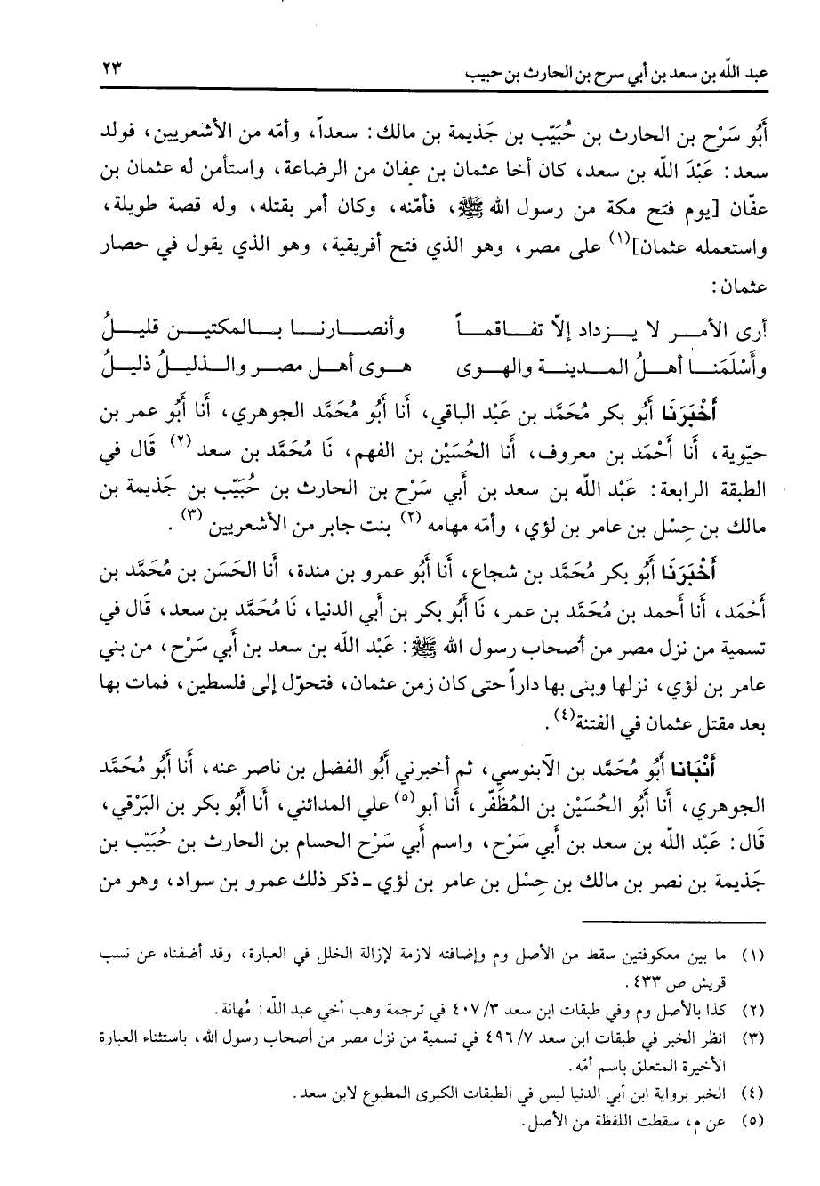أبو سرح بن الحارث بن حبيب بن جذيمة بن مالك سعدا وأمه من الأشعريين فولد سعد عبد الله بن سعد كان أخا عثمان بن عفان من الرضاعة واستأمن له عثمان بن عفان يوم فتح مكة من رسول الله (صلى الله عليه وسلم) فأمنه وكان أمر بقتله وله قصة طويلة واستعمله عثمان (1) على مصر وهو الذي فتح أفريقية وهو الذي يقول في حصار عثمان * أرى الأمر لا يزداد إلا تفاقما * وأنصارنا بالمكتين قليل وأسلمنا أهل المدينة والهوى * هوى أهل مصر والذليل ذليل * أخبرنا أبو بكر محمد بن عبد الباقي أنا أبو محمد الجوهري أنا أبو عمر بن حيوية أنا أحمد بن معروف أنا الحسين بن الفهم نا محمد بن سعد (2) قال في الطبقة الرابعة عبد الله بن سعد بن أبي سرح بن الحارث بن حبيب بن جذيمة بن مالك بن حسل بن عامر بن لؤي وأمه مهامه (2) بنت جابر من الأشعريين (3) أخبرنا أبو بكر محمد بن شجاع أنا أبو عمرو بن مندة أنا الحسن بن محمد بن أحمد أنا أحمد بن محمد بن عمر نا أبو بكر بن أبي الدنيا نا محمد بن سعد قال في تسمية من نزل مصر من أصحاب رسول الله (صلى الله عليه وسلم) عبد الله بن سعد بن أبي سرح من بني عامر بن لؤي نزلها وبنى بها دارا حتى كان زمن عثمان فتحول إلى فلسطين فمات بها بعد مقتل عثمان في الفتنة (4) أنبأنا أبو محمد بن الآبنوسي ثم أخبرني أبو الفضل بن ناصر عنه أنا أبو محمد الجوهري أنا أبو الحسين بن المظفر أنا أبو (5) علي المدائني أنا أبو بكر بن البرقي قال عبد الله بن سعد بن أبي سرح وأسم أبي سرح الحسام بن الحارث بن حبيب بن جذيمة بن نصر بن مالك بن حسل بن عامر بن لؤي ذكر ذلك عمرو بن سواد وهو من