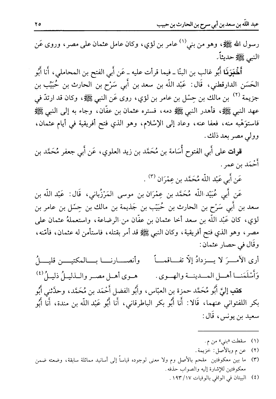 رسول الله (صلى الله عليه وسلم) وهو من بني (1) عامر بن لؤي وكان عامل عثمان على مصر وروى عن النبي (صلى الله عليه وسلم) حديثا أخبرنا أبو غالب بن البنا فيما قرأت عليه عن أبي الفتح بن المحاملي أنا أبو الحسن الدارقطني قال عبد الله بن سعد بن أبي سرح بن الحارث بن حبيب بن جزيمة (2) بن مالك بن حسل بن عامر بن لؤي روى عن النبي (صلى الله عليه وسلم) وكان قد ارتد في عهد النبي (صلى الله عليه وسلم) فأهدر النبي (صلى الله عليه وسلم) دمه فستره عثمان بن عفان وجاء به إلى النبي (صلى الله عليه وسلم) فاستوهبه منه فعفا عنه وعاد إلى الإسلام وهو الذي فتح أفريقية في أيام عثمان وولي مصر بعد ذلك قرأت على أبي الفتوح أسامة بن محمد بن زيد العلوي عن أبي جعفر محمد بن أحمد بن عمر عن أبي عبد الله محمد بن عمران (3) عن أبي عبيد الله محمد بن عمران بن موسى المرزباني قال عبد الله بن سعد بن أبي سرح بن الحارث بن حبيب بن جذيمة بن مالك بن حسل بن عامر بن لؤي كان عبد الله بن سعد أخا عثمان بن عفان من الرضاعة واستعمله عثمان على مصر وهو الذي فتح أفريقية وكان النبي (صلى الله عليه وسلم) قد أمر بقتله فاستأمن له عثمان فأمنه وقال في حصار عثمان * أرى الأمر لا يزداد إلا تفاقما * وأنصارنا بالمكتين قليل وأسلمنا أهل المدينة والهوى * هوى أهل مصر والذليل ذليل (4) * كتب إلي أبو محمد حمزة بن العباس وأبو الفضل أحمد بن محمد وحدثني أبو بكر اللفتواني عنهما قالا أنا أبو بكر الباطرقاني أنا أبو عبد الله بن مندة أنا أبو سعيد بن يونس قال