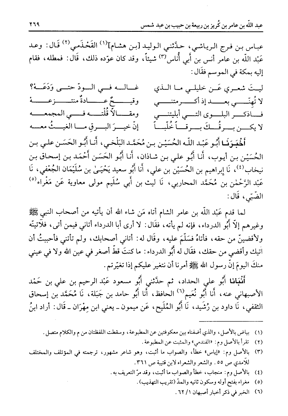 عباس بن فرج الرياشي حدثني الوليد بن هشام (1) القحذمي (2) قال وعد عبد الله بن عامر أنس بن أبي أناس (3) شيئا وقد كان عوده ذلك قال فمطله فقال إليه بمكة في الموسم فقال * ليت شعري عن خليلي ما الذي * غاله في الود حتى ودعه لا تهني بعد إذ أكرمتني * وقيح عادة منتزعه فاذكر البلوى التي أبليتني * ومقالا قلته في المجمعه لا يكن برقك برقا خلبا * إن خير البرق ما الغيث معه * أخبرنا أبو عبد الله الحسين بن محمد البلخي أنا أبو الحسن علي بن الحسين بن أيوب أنا أبو علي بن شاذان أنا أبو الحسن أحمد بن إسحاق بن نيخاب (4) نا إبراهيم بن الحسين بن علي أنا أبو سعيد يحيى بن سليمان الجعفي نا عبد الرحمن بن محمد المحاربي نا ليث بن أبي سليم مولى معاوية عن مغراء (5) الضبي قال لما قدم عبد الله بن عامر الشام أتاه من شاء الله أن يأتيه من أصحاب النبي (صلى الله عليه وسلم) وغيرهم إلا أبو الدرداء فإنه لم يأته فقال لا أرى أبا الدرداء أتاني فيمن أتى فلآتينه ولأقضين من حقه فأتاه فسلم عليه وقال له أتاني أصحابك ولم تأتني فأحببت أن آتيك وأقضي من حقك فقال له أبو الدرداء ما كنت قط أصغر في عين الله ولا في عيني منك اليوم إن رسول الله (صلى الله عليه وسلم) أمرنا أن نتغير عليكم إذا تغيرتم أنبأنا أبو علي الحداد ثم حدثني أبو مسعود عبد الرحيم بن علي بن حمد الأصبهاني عنه أنا أبو نعيم (6) الحافظ أنا أبو حامد بن جبلة نا محمد بن إسحاق الثقفي نا داود بن رشيد نا أبو المليح عن ميمون يعني ابن مهران قال أراد ابن