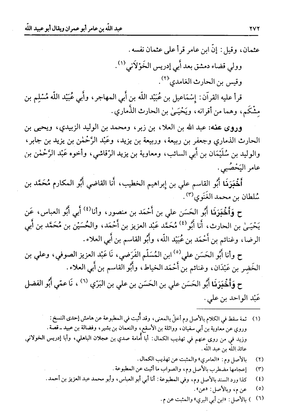 عثمان وقيل إن ابن عامر قرأ على عثمان نفسه وولي قضاء دمشق بعد أبي إدريس الخولاني (1) وقيس بن الحارث الغامدي (2) قرأ عليه القرآن إسماعيل بن عبيد الله بن أبي المهاجر وأبي عبيد الله مسلم بن مشكم وهما أقرانه ويحيى بن الحارث الذماري وروى عنه عبد الله بن العلا بن زبر ومحمد بن الوليد الزبيدي ويحيى بن الحارث الذماري وجعفر بن ربيعة وربيعة بن يزيد وعبد الرحمن بن يزيد بن جابر والوليد بن سليمان بن أبي السائب ومعاوية بن يزيد الرقاشي وأخوه عبد الرحمن بن عامر اليحصبي أخبرنا أبو القاسم علي بن إبراهيم الخطيب أنا القاضي أبو المكارم محمد بن سلطان بن محمد الفنوي (3) ح وأخبرنا أبو الحسن علي بن أحمد بن منصور وأنا أبي أبو العباس عن يحيى بن الحارث أنا أبو (4) محمد عبد العزيز بن أحمد والحسين بن محمد بن أبي الرضا وغنائم بن أحمد بن عبيد الله وأبو القاسم بن أبي العلاء ح وأنا أبو الحسن علي (5) ابن المسلم الفرضي نا عبد العزيز الصوفي وعلي بن الخضر بن عبدان وغنائم بن أحمد الخياط وأبو القاسم بن أبي العلاء ح وأخبرنا أبو الحسن علي بن الحسن بن علي بن البري (6) نا عمي أبو الفضل عبد الواحد بن علي