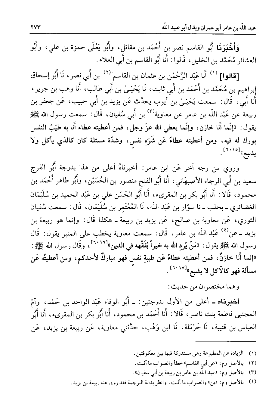 وأخبرنا أبو القاسم نصر بن أحمد بن مقاتل وأبو يعلى حمزة بن علي وأبو العشائر محمد بن الخليل قالوا أنا أبو القاسم بن أبي العلاء قالوا (1) أنا عبد الرحمن بن عثمان بن القاسم (2) بن أبي نصر نا أبو إسحاق إبراهيم بن محمد بن أحمد بن أبي ثابت نا يحيى بن أبي طالب أنا وهب بن جرير أنا أبي قال سمعت يحيى بن أيوب يحدث عن يزيد بن أبي حبيب عن جعفر بن ربيعة عن عبد الله بن عامر عن معاوية (3) بن أبي سفيان قال سمعت رسول الله (صلى الله عليه وسلم) يقول إنما أنا خازن وإنما يعطي الله عز وجل فمن أعطيته عطاء أنا به طيب النفس بورك له فيه ومن أعطيته عطاء عن شره نفس وشدة مسألة كان كالذي يأكل ولا يشبع