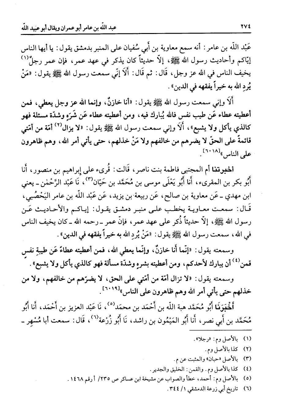 [6018] أخبرتنا أم المجتبى فاطمة بنت ناصر قالت قرئ على إبراهيم بن منصور أنا أبو بكر بن المقرئ أنا أبو يعلى موسى بن محمد بن حيان (3) نا عبد الرحمن يعني ابن مهدي عن معاوية بن صالح عن ربيعة بن يزيد عن عبد الله بن عامر اليحصبي قال سمعت معاوية يخطب على منبر دمشق يقول إياكم والأحاديث عن رسول الله (صلى الله عليه وسلم) إلا حديث ذكر على عهد عمر فإن عمر رحمه الله كان يخيف الناس في الله سمعت رسول الله (صلى الله عليه وسلم) يقول من يرد الله به خيرا يفقهه في الدين وسمعته يقول إنما أنا خازن وإنما يعطي الله فمن أعطيته عطاء عن طيبة نفس قمن (4) أن يبارك لأحدكم ومن أعطيته بشره وشدة مسألة فهو كالذي يأكل ولا يشبع وسمعته يقول لا تزال أمة من أمتي على الحق لا يضرهم من خالفهم ولا من خذلهم حتى يأتي أمر الله وهم ظاهرون على الناس