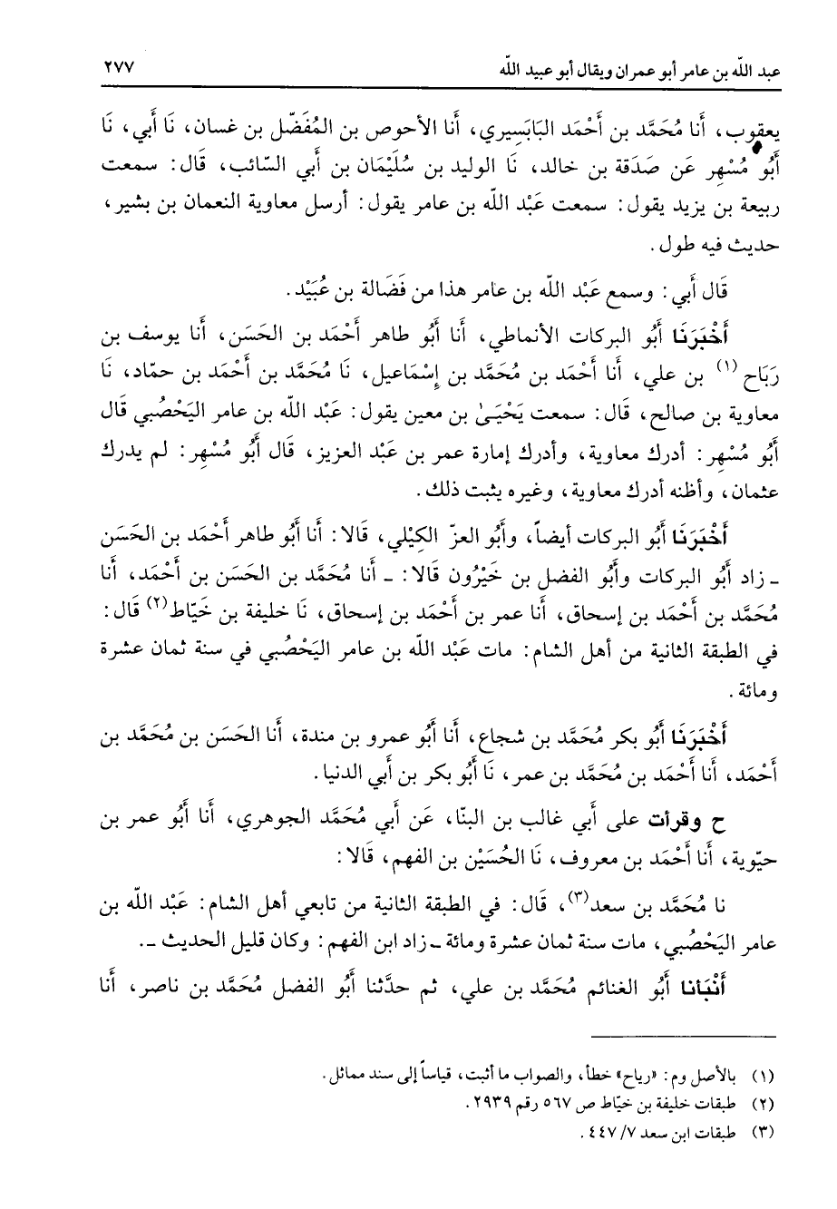 يعقوب أنا محمد بن أحمد البابسيري أنا الأحوص بن المفضل بن غسان نا أبي نا أبو مسهر عن صدقة بن خالد نا الوليد بن سليمان بن أبي السائب قال سمعت ربيعة بن يزيد يقول سمعت عبد الله بن عامر يقول أرسل معاوية النعمان بن بشير حديث فيه طول قال أبي وسمع عبد الله بن عامر هذا من فضالة بن عبيد أخبرنا أبو البركات الأنماطي أنا أبو طاهر أحمد بن الحسن أنا يوسف بن رباح (1) بن علي أنا أحمد بن محمد بن إسماعيل نا محمد بن أحمد بن حماد نا معاوية بن صالح قال سمعت يحيى بن معين يقول عبد الله بن عامر اليحصبي قال أبو مسهر أدرك معاوية وأدرك إمارة عمر بن عبد العزيز قال أبو مسهر لم يدرك عثمان وأظنه أدرك معاوية وغيره يثبت ذلك أخبرنا أبو البركات أيضا وأبو العز الكيلي قالا أنا أبو طاهر أحمد بن الحسن زاد أبو البركات وأبو الفضل بن خيرون قالا أنا محمد بن الحسن بن أحمد أنا محمد بن أحمد بن إسحاق أنا عمر بن أحمد بن إسحاق نا خليفة بن خياط (2) قال في الطبقة الثانية من أهل الشام مات عبد الله بن عامر اليحصبي في سنة ثمان عشرة ومائة أخبرنا أبو بكر محمد بن شجاع أنا أبو عمرو بن مندة أنا الحسن بن محمد بن أحمد أنا أحمد بن محمد بن عمر نا أبو بكر بن أبي الدنيا ح وقرأت على أبي غالب بن البنا عن أبي محمد الجوهري أنا أبو عمر بن خيوية أنا أحمد بن معروف نا الحسين بن الفهم قالا نا محمد بن سعد (3) قال في الطبقة الثانية من تابعي أهل الشام عبد الله بن عامر اليحصبي مات سنة ثمان عشرة ومائة زاد ابن الفهم وكان قليل الحديث أنبأنا أبو الغنائم محمد بن علي ثم حدثنا أبو الفضل محمد بن ناصر أنا