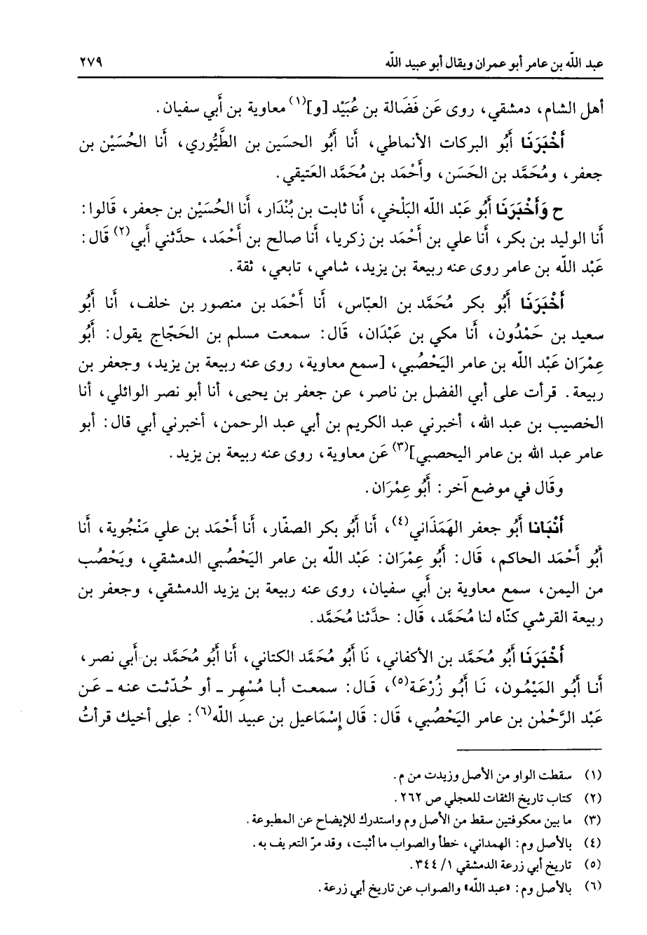 أهل الشام دمشقي روى عن فضالة بن عبيد و (1) معاوية بن أبي سفيان أخبرنا أبو البركات الأنماطي أنا أبو الحسين بن الطيوري أنا الحسين بن جعفر ومحمد بن الحسن وأحمد بن محمد العتيقي ح وأخبرنا أبو عبد الله البلخي أنا ثابت بن بندار أنا الحسين بن جعفر قالوا أنا الوليد بن بكر أنا علي بن أحمد بن زكريا أنا صالح بن أحمد حدثني أبي (2) قال عبد الله بن عامر روى عنه ربيعة بن يزيد شامي تابعي ثقة أخبرنا أبو بكر محمد بن العباس أنا أحمد بن منصور بن خلف أنا أبو سعيد بن حمدون أنا مكي بن عبدان قال سمعت مسلم بن الحجاج يقول أبو عمران عبد الله بن عامر اليحصبي سمع معاوية روى عنه ربيعة بن يزيد وجعفر بن ربيعة قرأت على أبي الفضل بن ناصر عن جعفر بن يحيى أنا أبو نصر الوائلي أنا الخصيب بن عبد الله أخبرني عبد الكريم بن أبي عبد الرحمن أخبرني أبي قال أبو عامر عبد الله بن عامر اليحصبي (3) عن معاوية روى عنه ربيعة بن يزيد وقال في موضع آخر أبو عمران أنبأنا أبو جعفر الهمذاني (4) أنا أبو بكر الصفار أنا أحمد بن علي منجوية أنا أبو أحمد الحاكم قال أبو عمران عبد الله بن عامر اليحصبي الدمشقي ويحصب من اليمن سمع معاوية بن أبي سفيان روى عنه ربيعة بن يزيد الدمشقي وجعفر بن ربيعة القرشي كناه لنا محمد قال حدثنا محمد أخبرنا أبو محمد بن الأكفاني نا أبو محمد الكتاني أنا أبو محمد بن أبي نصر أنا أبو الميمون نا أبو زرعة (5) قال سمعت أبا مسهر أو حدثت عنه عن عبد الرحمن بن عامر اليحصبي قال قال إسماعيل بن عبيد الله (6) على أخيك قرأت
